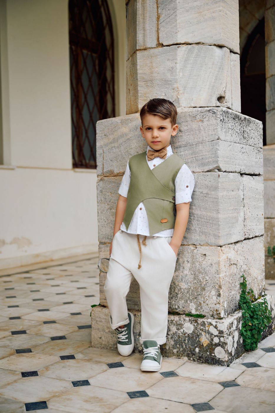 Ένα κομψό βαπτιστικό σύνολο, έξι τεμαχίων, σε λαδί, εκρού και καφέ αποχρώσεις, που συνδυάζει φυσική αισθητική και μοντέρνο στυλ, ιδανικό για μια ξεχωριστή εμφάνιση την ημέρα της βάπτισης. Το σετ περιλαμβάνει λευκό πουκάμισο με διακριτικό γεωμετρικό μοτίβο, το οποίο προσθέτει μια ιδιαίτερη αλλά κομψή λεπτομέρεια στο σύνολο. Συνδυάζεται με ένα εντυπωσιακό γιλέκο σε χακί απόχρωση με μοντέρνο ασύμμετρο σχεδιασμό, που χαρίζει χαρακτήρα και μοναδικό στυλ. Το καφέ παπιγιόν ολοκληρώνει αρμονικά την εμφάνιση με μια κομψή και γλυκιά πινελιά. Το σύνολο συμπληρώνεται με εκρού παντελόνι τύπου baggy, με άνετη εφαρμογή και διακοσμητικό κορδόνι στη μέση, προσφέροντας στυλ αλλά και ελευθερία κινήσεων στον μικρό πρωταγωνιστή της ημέρας.