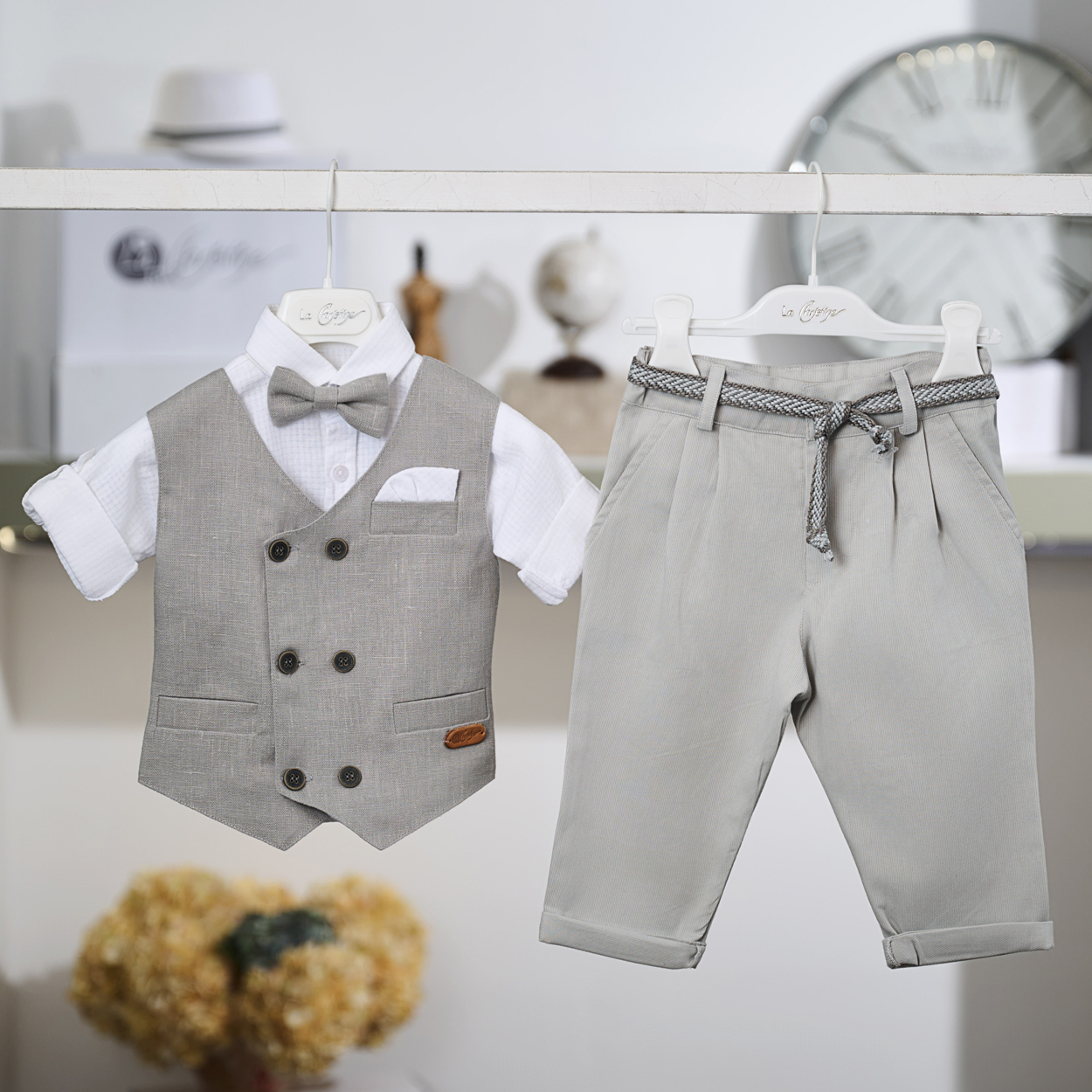 Ένα κομψό και διαχρονικό βαπτιστικό σετ για αγόρι, σε γκρι αποχρώσεις, έξι τεμαχίων, ιδανικό για μια ιδιαίτερη και προσεγμένη εμφάνιση την ημέρα της βάπτισης. Το σύνολο περιλαμβάνει λευκό πουκάμισο με διακριτική καρό ύφανση, που χαρίζει κομψότητα και ξεχωριστή υφή στο ντύσιμο. Συνδυάζεται με γιλέκο με διπλή σειρά κουμπιών και περίτεχνη υφαντή υφή, το οποίο προσθέτει φινέτσα και διαχρονικό χαρακτήρα στο σύνολο. Το διακοσμητικό μαντηλάκι στο τσεπάκι και το παπιγιόν σε ταιριαστή απόχρωση ολοκληρώνουν αρμονικά την επίσημη εμφάνιση. Το παντελόνι σε άνετη γραμμή συνοδεύεται από ζώνη τύπου μακραμέ με διακριτικό μοτίβο, προσθέτοντας ιδιαίτερο στυλ και μια ξεχωριστή πινελιά στο σύνολο. Τα προσεγμένα υφάσματα και οι κομψές λεπτομέρειες δημιουργούν ένα ισορροπημένο αποτέλεσμα που συνδυάζει άνεση και διακριτική πολυτέλεια.