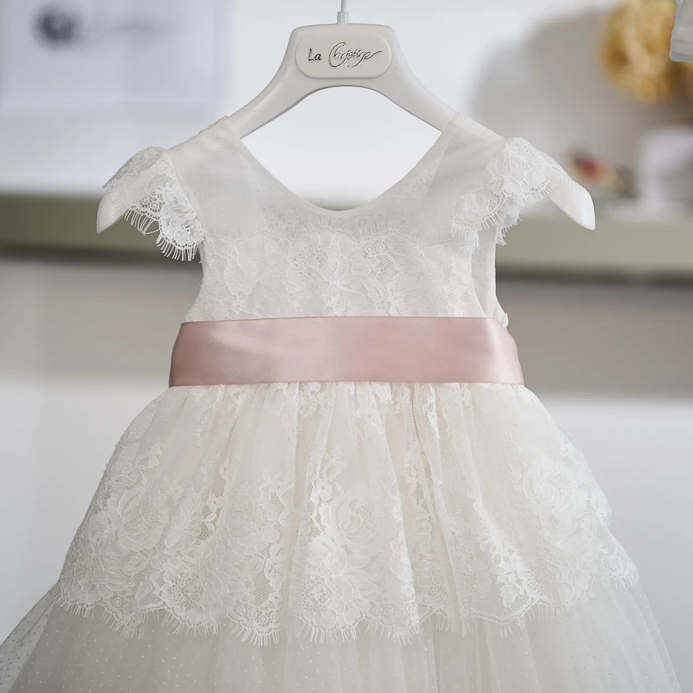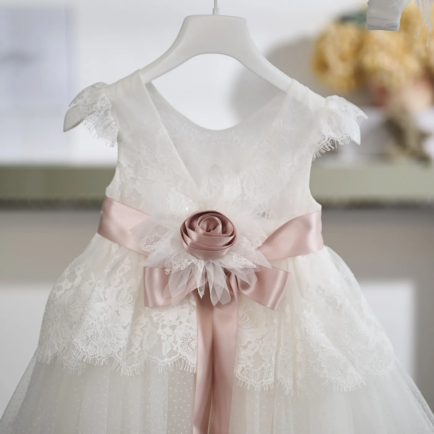 Το κορσάζ είναι διακοσμημένο με λεπτεπίλεπτη δαντέλα που αγκαλιάζει το επάνω μέρος του φορέματος, ενώ τα μικρά δαντελένια μανικάκια προσθέτουν μια ρομαντική πινελιά στο σχέδιο. Στη μέση, μια σατέν ζώνη στην απόχρωση της πούδρας στολίζεται με χειροποίητο λουλούδι και φιόγκο, δημιουργώντας μια όμορφη χρωματική αντίθεση.