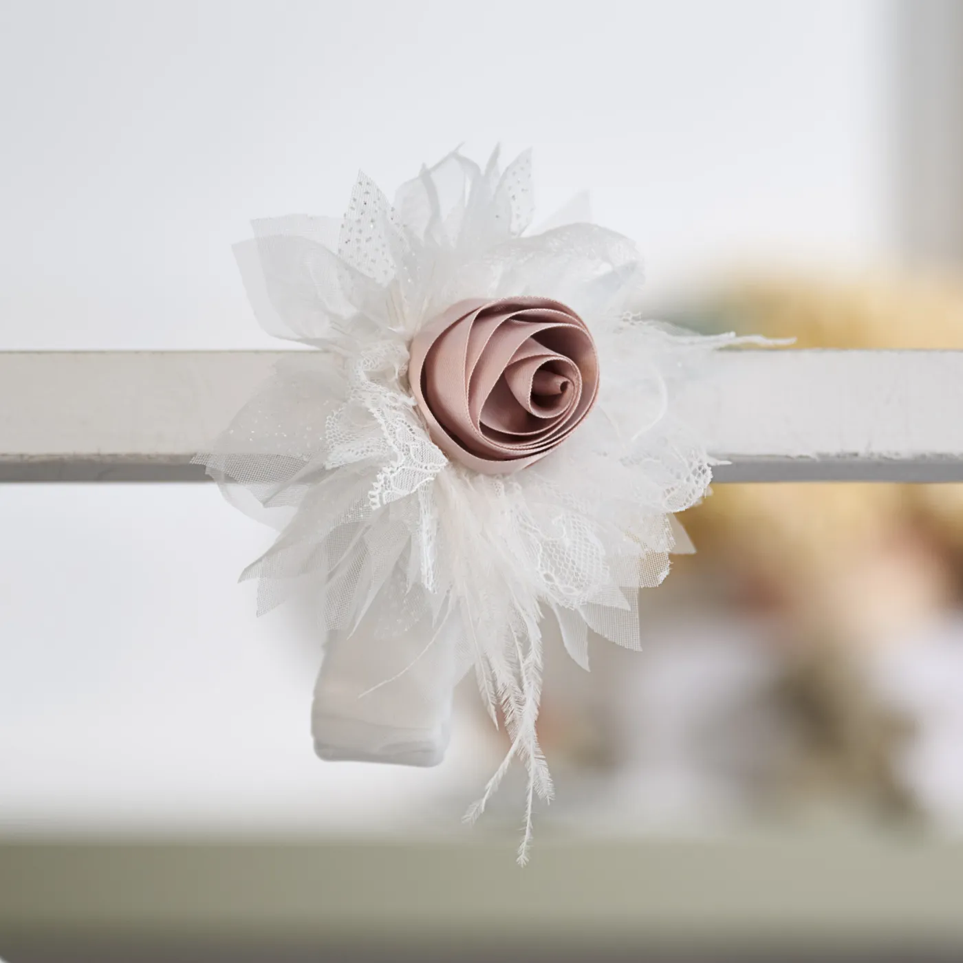 Το σύνολο συμπληρώνεται από ασορτί κορδέλα μαλλιών με τούλι και σατέν χειροποίητο λουλούδι στην απόχρωση της πούδρας, ολοκληρώνοντας κομψά την εμφάνιση.