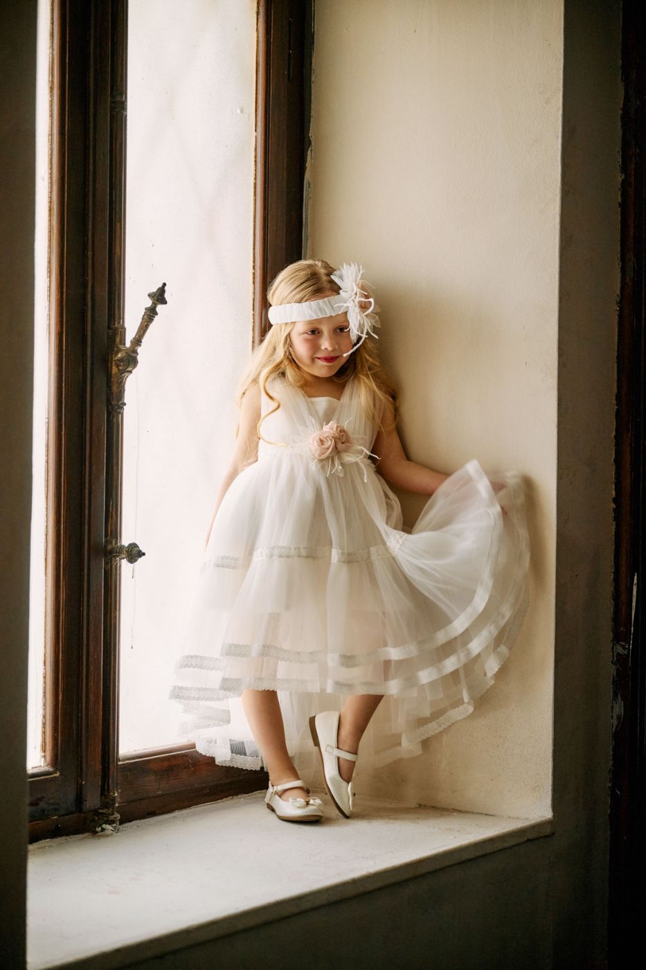 Το σύνολο συμπληρώνεται με ασορτί κορδέλα μαλλιών διακοσμημένη με τούλι και χειροποίητο λουλούδι στην ίδια απόχρωση.
