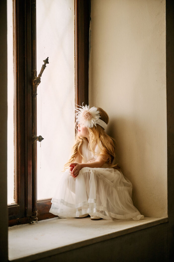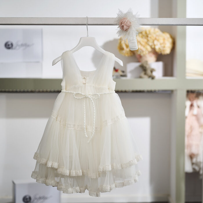 Η διακριτική κομψότητα και η ρομαντική αισθητική χαρακτηρίζουν αυτό το ιδιαίτερα καλαίσθητο βαπτιστικό φόρεμα σε ιβουάρ απόχρωση.