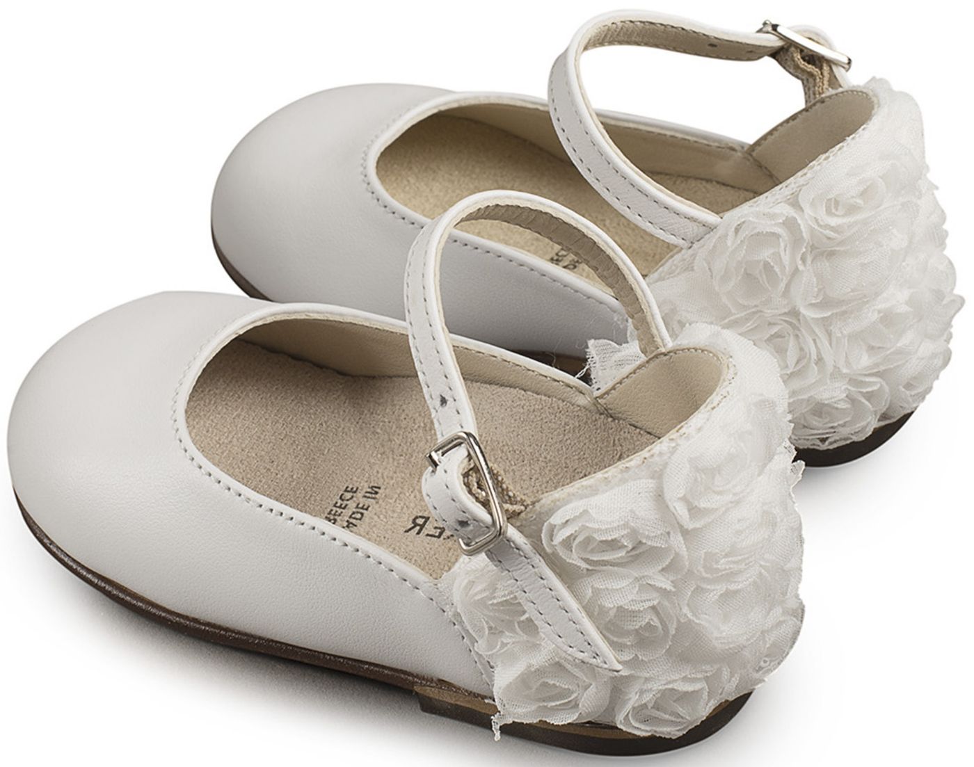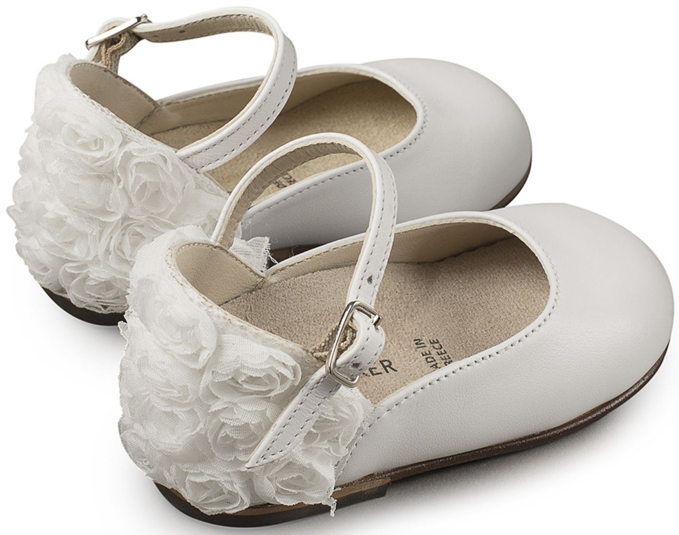 Δερμάτινο Γαλλικό Γοβάκι με Διακοσμημένη Φτέρνα από Chiffon Λουλούδια σε Λευκό Χρώμα