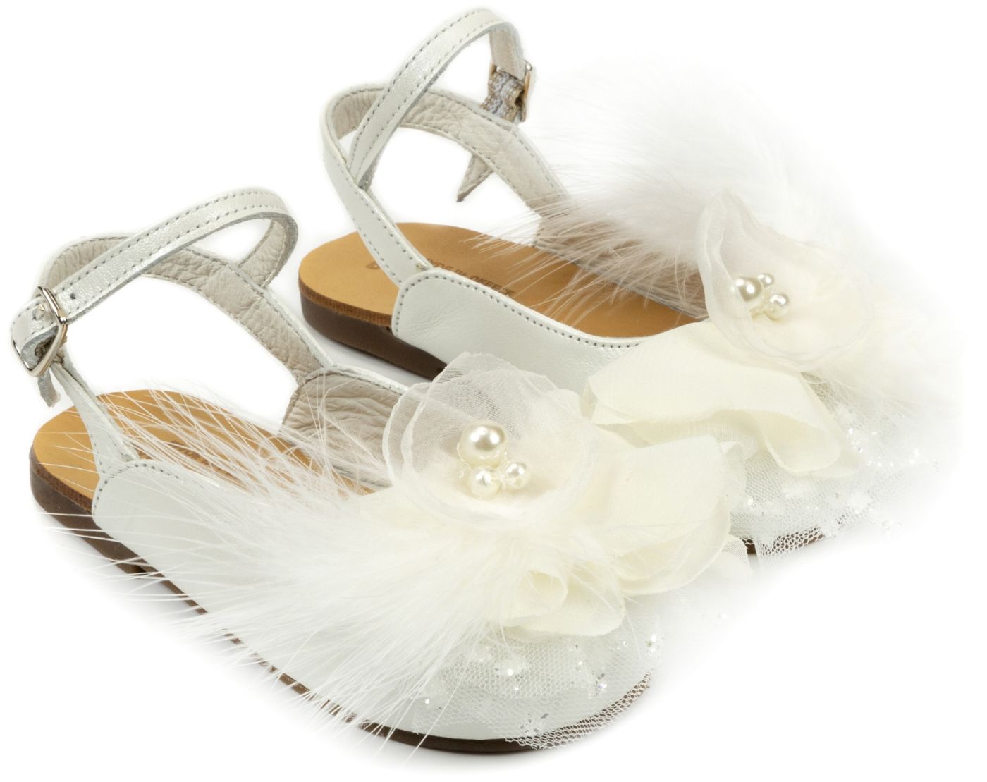 Δερμάτινο Σαμπό Διακοσμημένο με Χειροποίητο Chiffon Λουλούδι και Πούπουλα από Δέρμα Πέρλα σε Εκρού Χρώμα