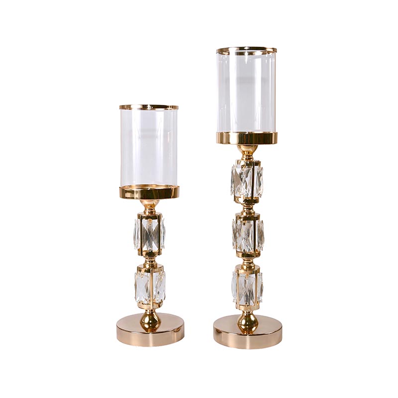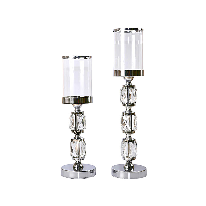 - Υλικό και Χρώμα: Τα κηροπήγια διαθέτουν βάση και μεταλλικά μέρη σε ασημί χρώμα με γυαλιστερό φινίρισμα. Ο κεντρικός κορμός κοσμείται με ορθογώνια κρυστάλλινα στοιχεία.