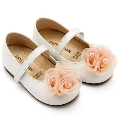 Δερμάτινο Γοβάκι Μονή Μπαρέτα Χρατς με Υφασμάτινα Χειροποίητα Λουλούδια Οργάντζας και Πέρλα σε Εκρού Ροζ Χρώμα