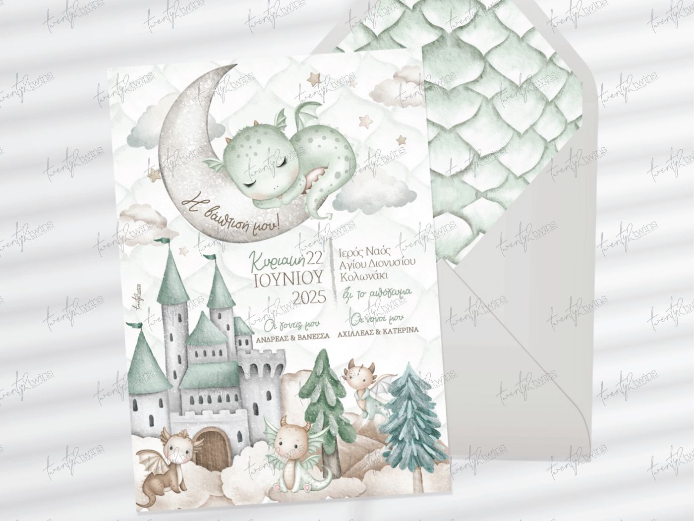 Προσκλητήριο βάπτισης για αγόρι με το μοναδικό θέμα "Dragon & Castle" από την 22twins. Η κάρτα σε ματ χαρτί 300γρ. συνδυάζεται άψογα με τον φάκελο που διαθέτει εσωτερική φόδρα με σχέδιο φολίδες, προσδίδοντας μια premium αισθητική στην αναγγελία της βάπτισής σας.