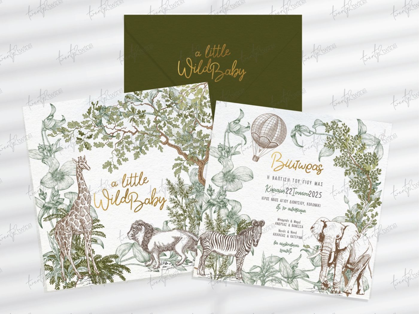 Πρωτότυπο προσκλητήριο βάπτισης 22twins με θέμα Safari & Jungle.