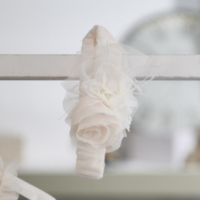 Το φόρεμα συνοδεύεται από ασορτί κορδέλα μαλλιών σε βανίλια τόνο, διακοσμημένη με τούλι και χειροποίητο λουλούδι, ολοκληρώνοντας αρμονικά την εμφάνιση
