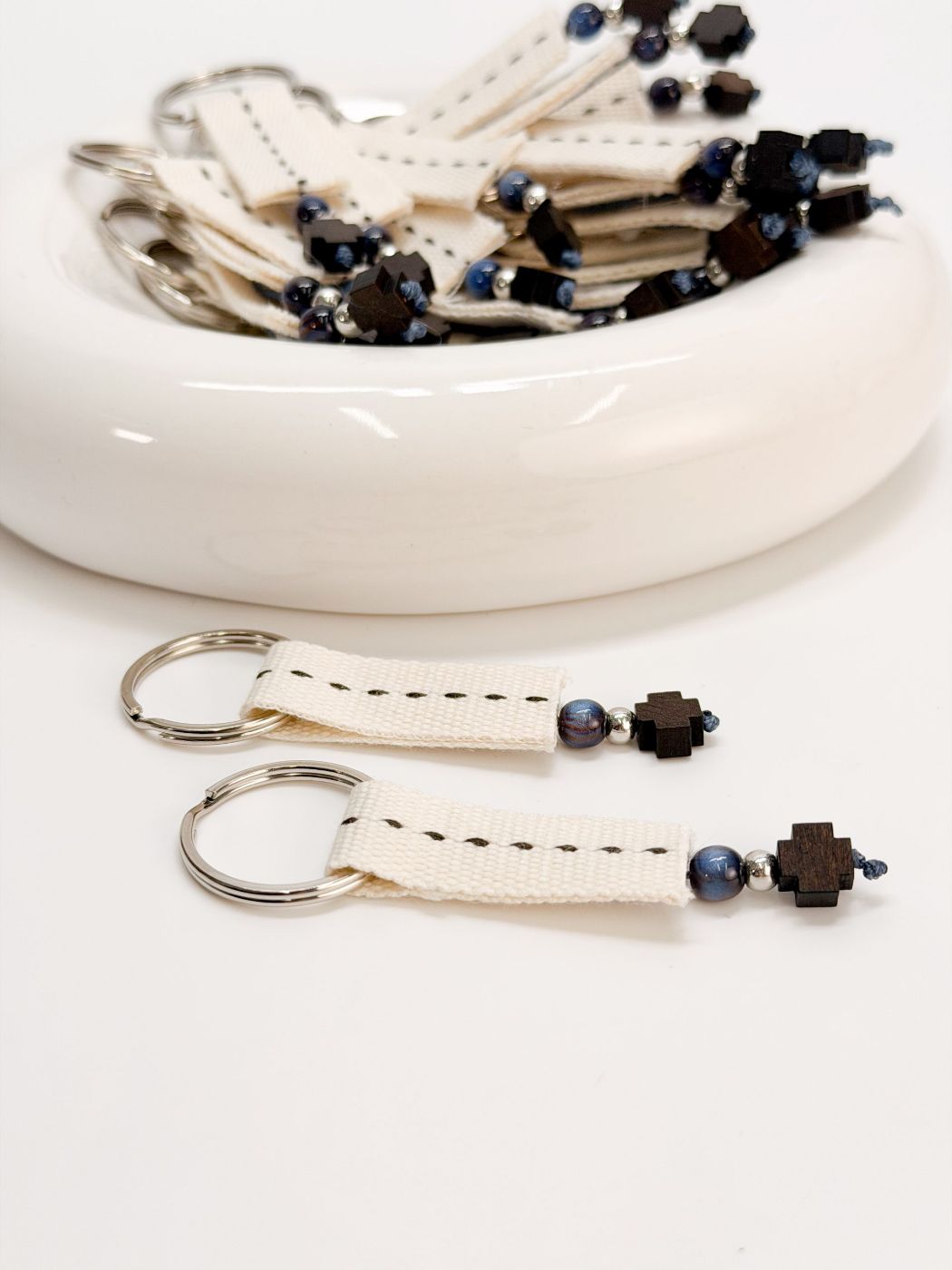 Μαρτυρικό μπρελόκ με εκρού τρέσα,ξύλινο σταυρό,μπλε χάντρα και ασημί στοιχεία. Ένα μαρτυρικό δώρο που θα μείνει στους καλεσμένους σας.