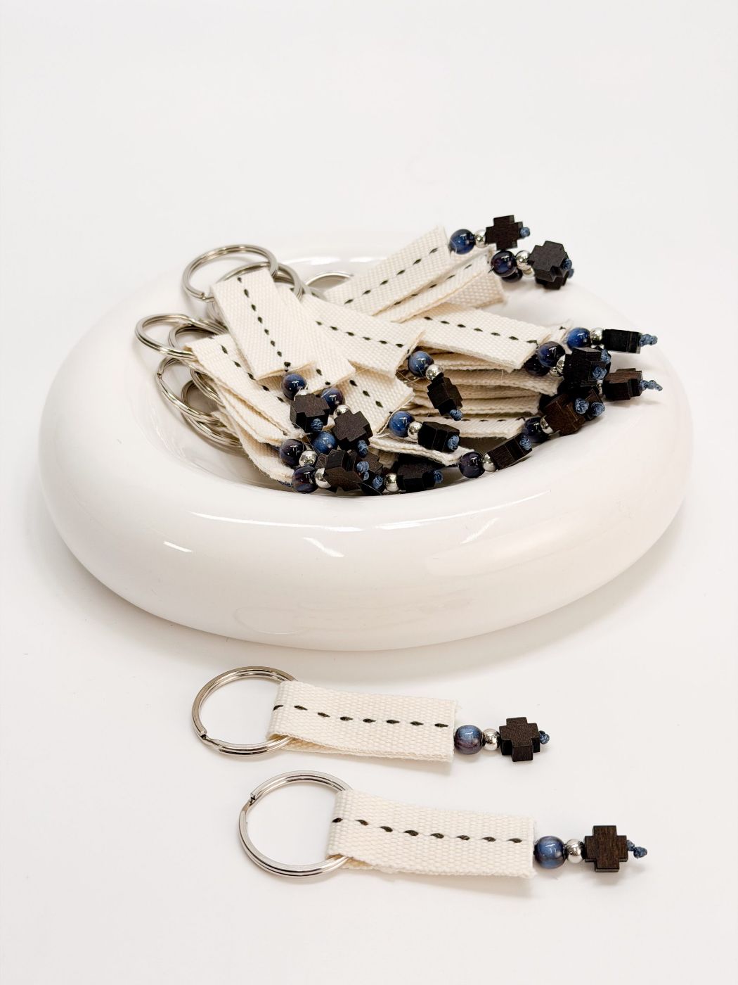 Μαρτυρικό μπρελόκ με εκρού τρέσα, ξύλινο σταυρό, μπλε χάντρα και ασημί στοιχεία.