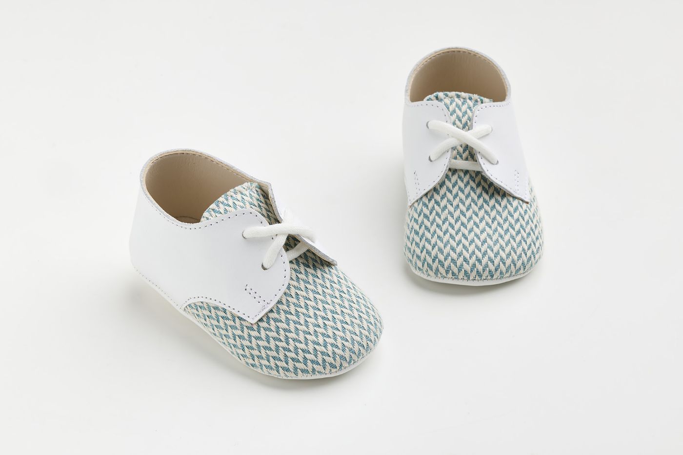 A602B - παπουτσάκι αγκαλιάς σε λευκό λείο δέρμα και ύφασμα με aqua μοτίβο