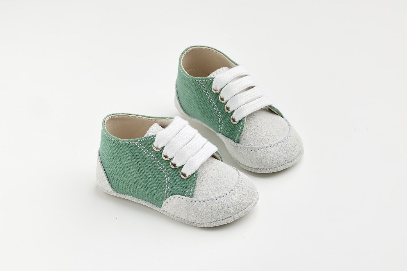 παπουτσάκι αγκαλιάς σε λευκό καστόρ δέρμα και πράσινο ύφασμα