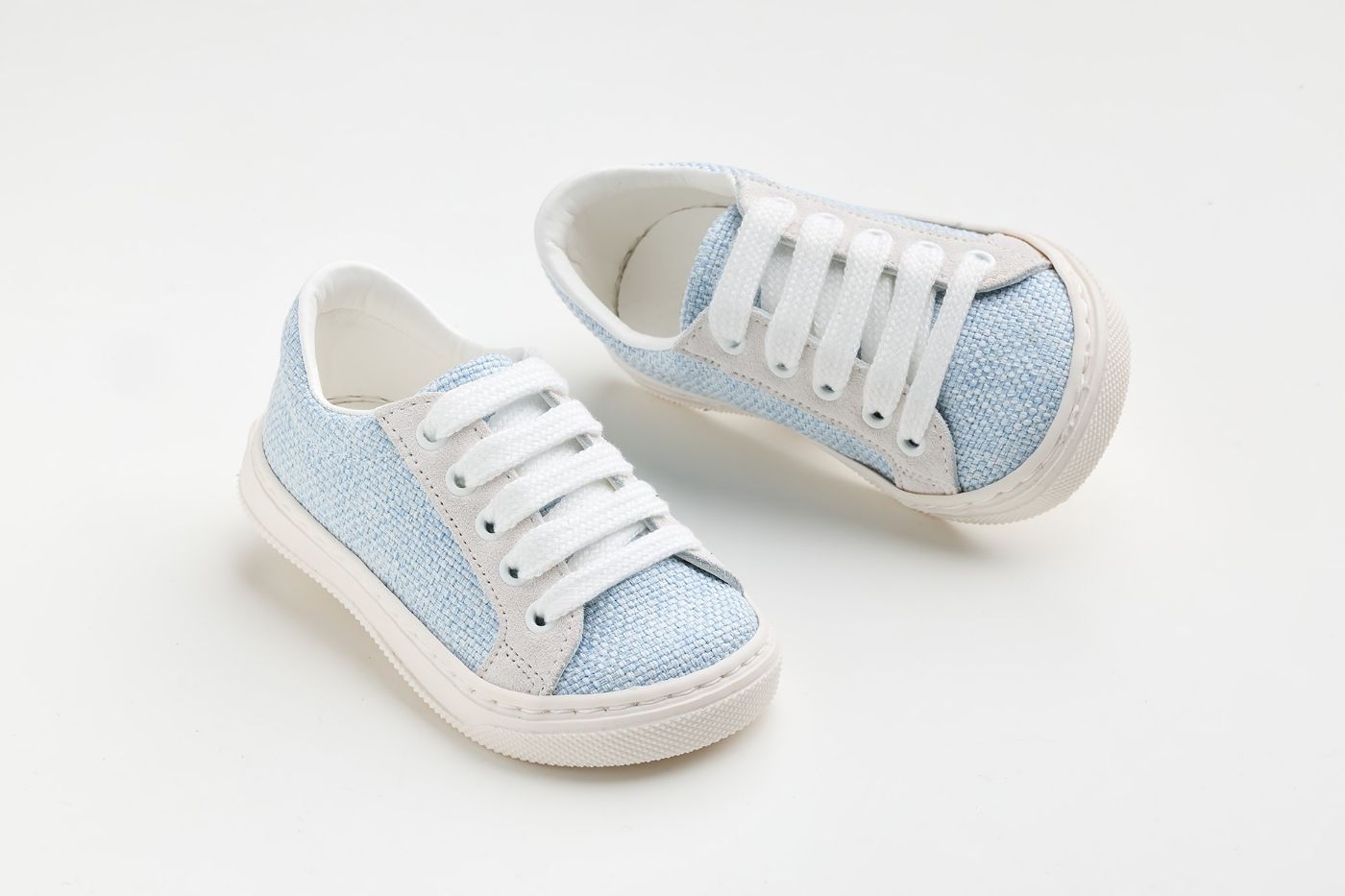 παπουτσάκι περπατήματος σε γαλάζιο ύφασμα και λευκό καστόρ δέρμα