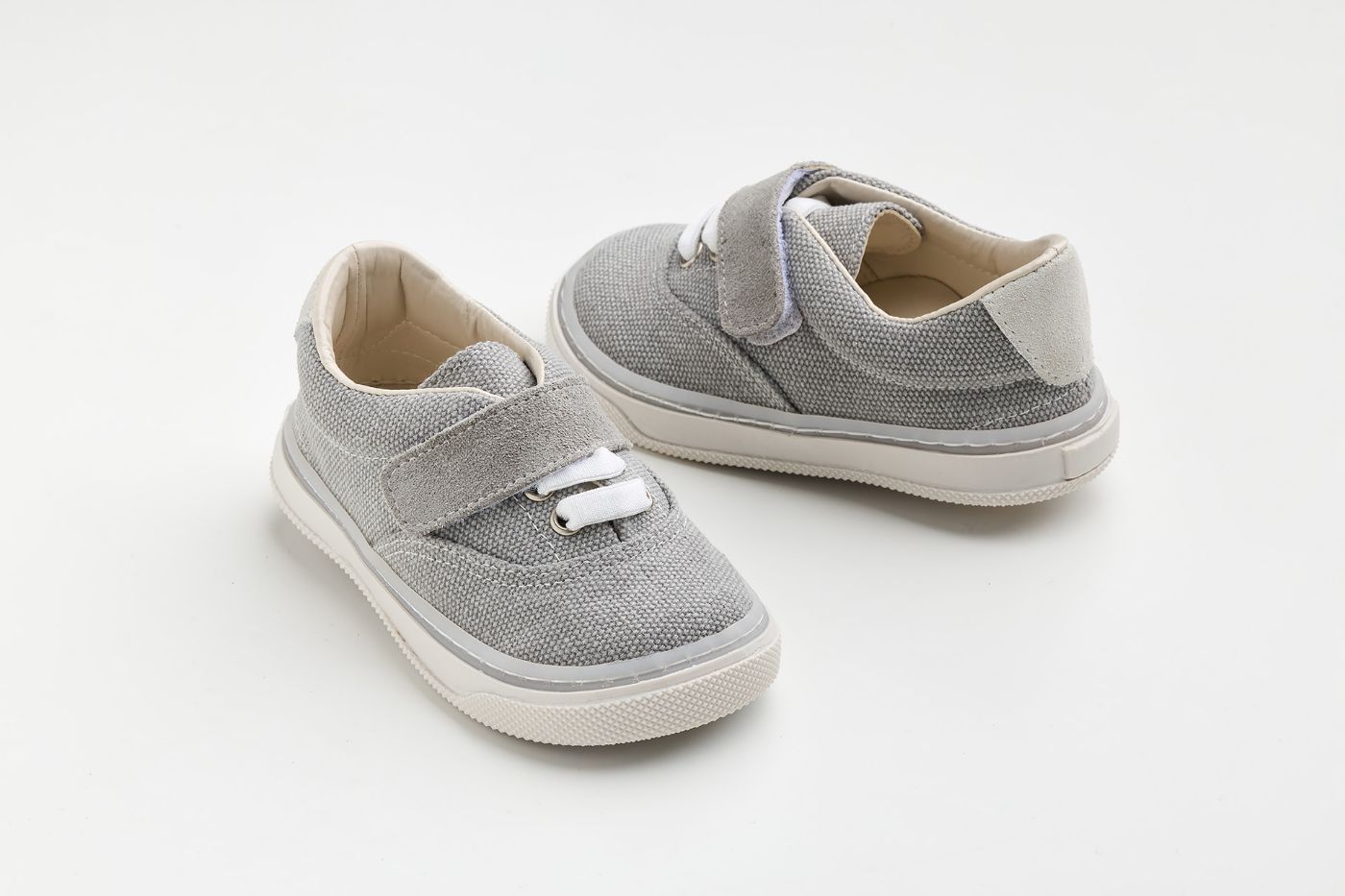παπουτσάκι περπατήματος σε γκρι ύφασμα, γκρι και λευκό καστόρ δέρμα και κλείσιμο με ελαστικό κορδόνι και velcro