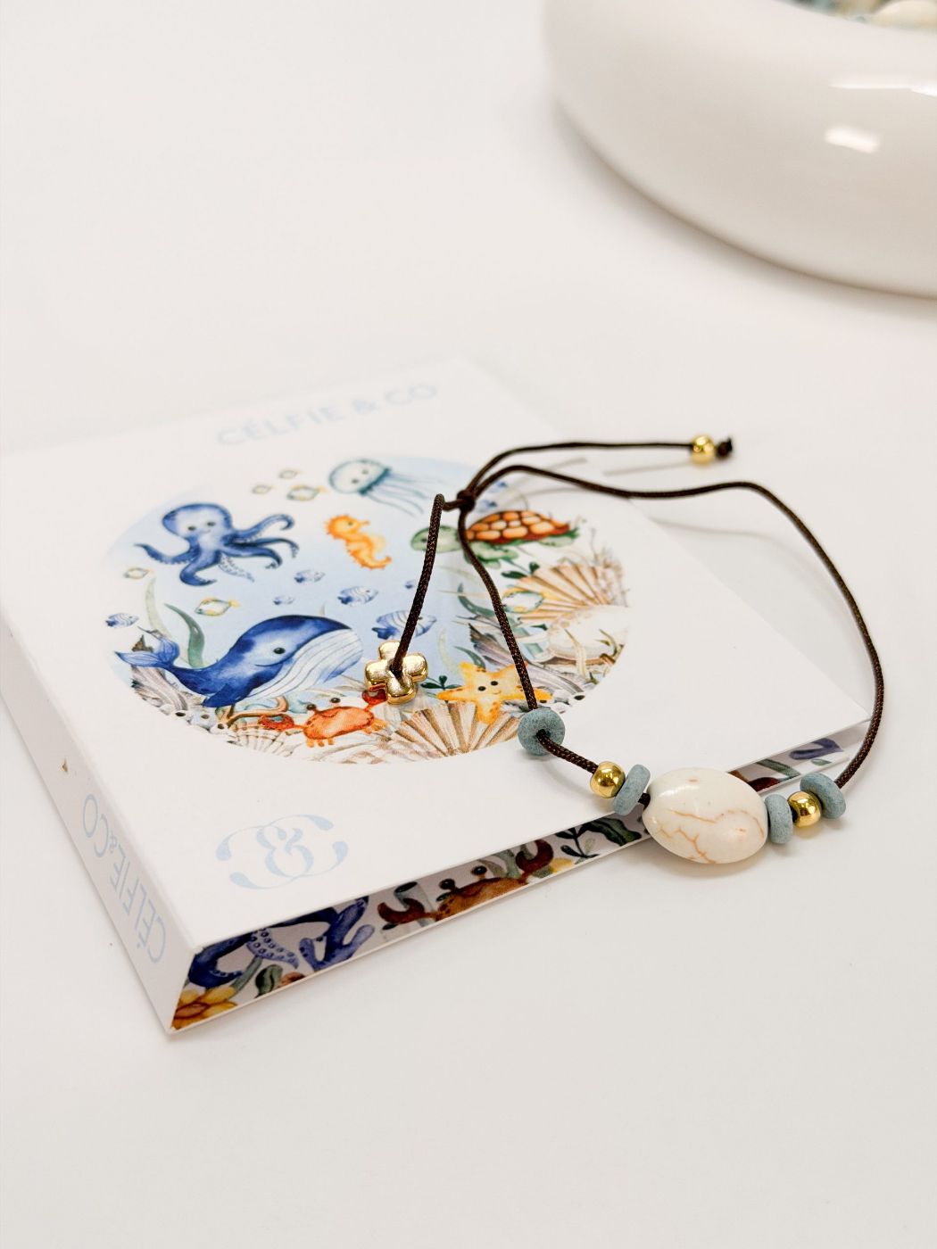 Μαρτυρικό βραχιόλι με καφέ σατέν κορδόνι, χάντρα χαολίτη, γαλάζιες κεραμικές ροδέλες και επιχρυσωμένο σταυρό.