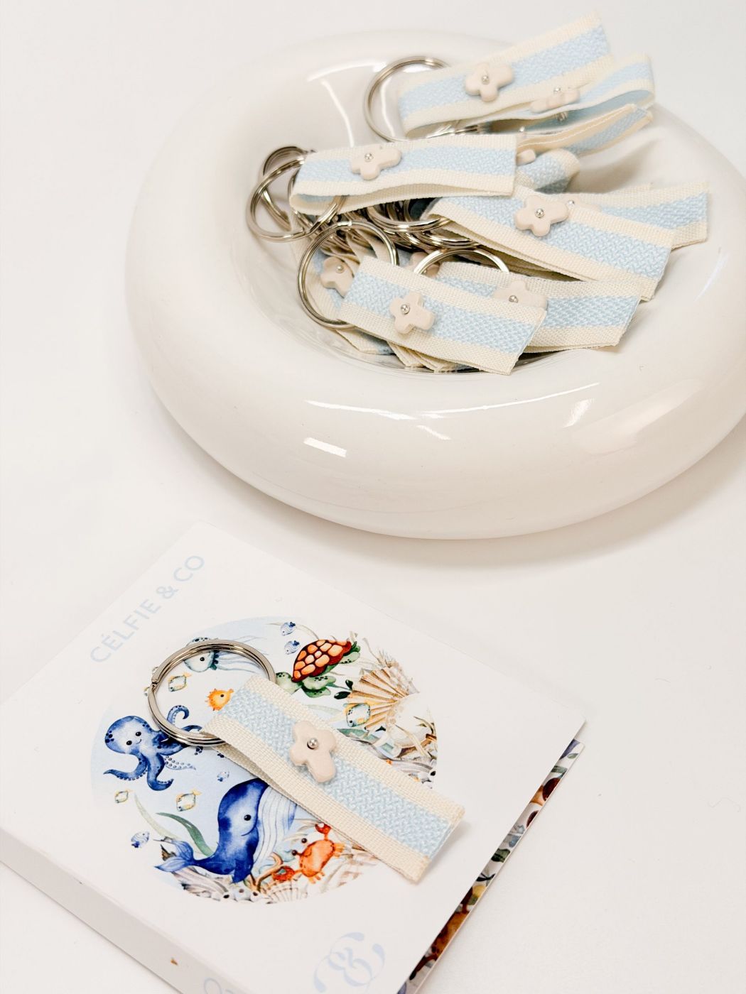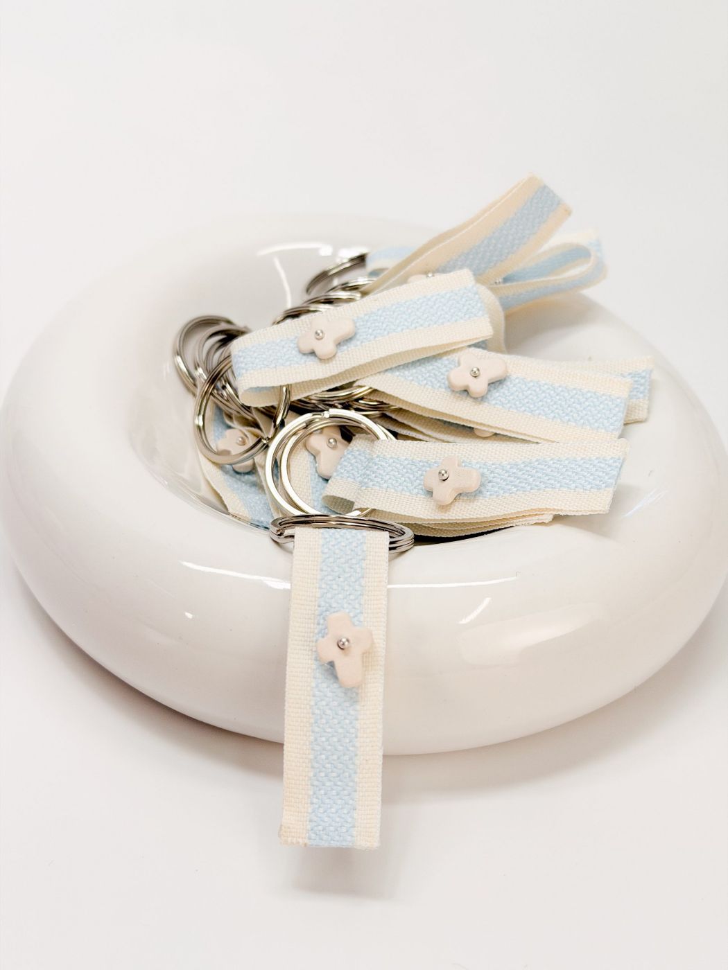 Μαρτυρικό μπρελόκ με δίχρωμη τρέσα, κεραμικό σταυρό και ασημί στοιχεία. Ένα μαρτυρικό δώρο που θα μείνει στους καλεσμένους σας.
