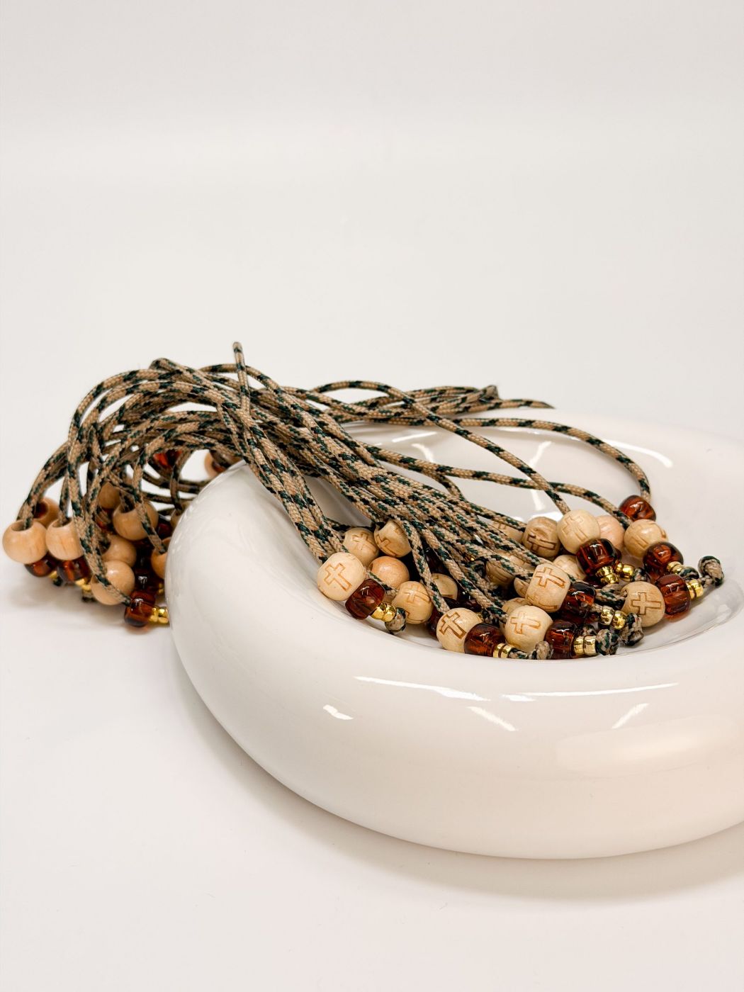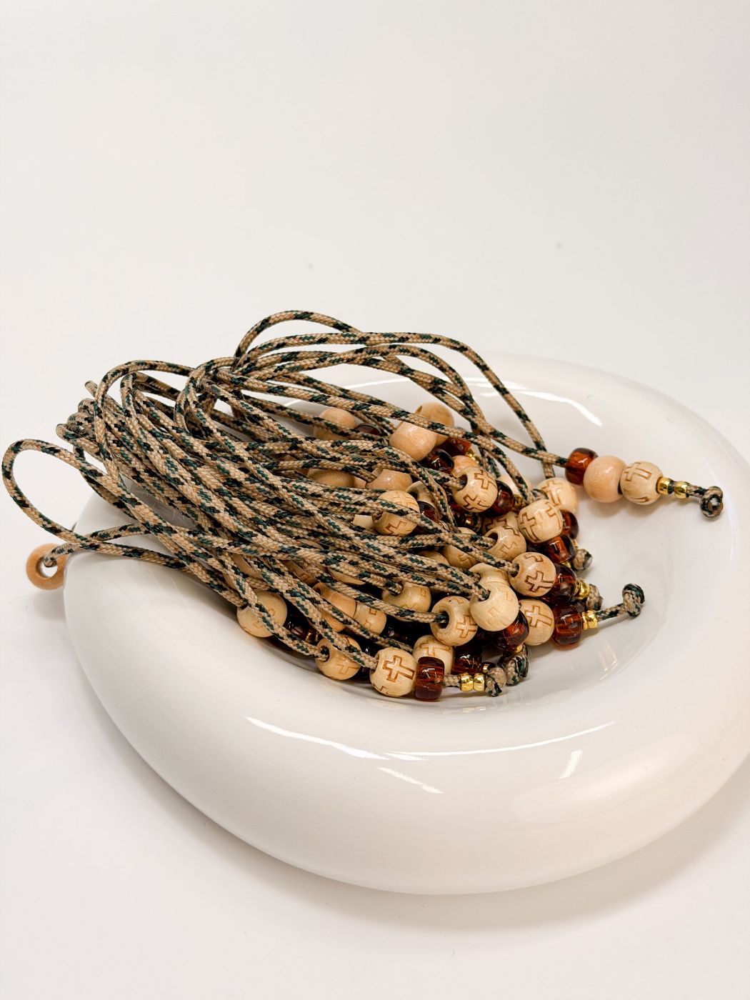 Μαρτυρικό βραχιόλι με κορδόνι σε 3 αποχρώσεις,καφέ ακρυλική χάντρα και επιχρυσωμένο σταυρό.