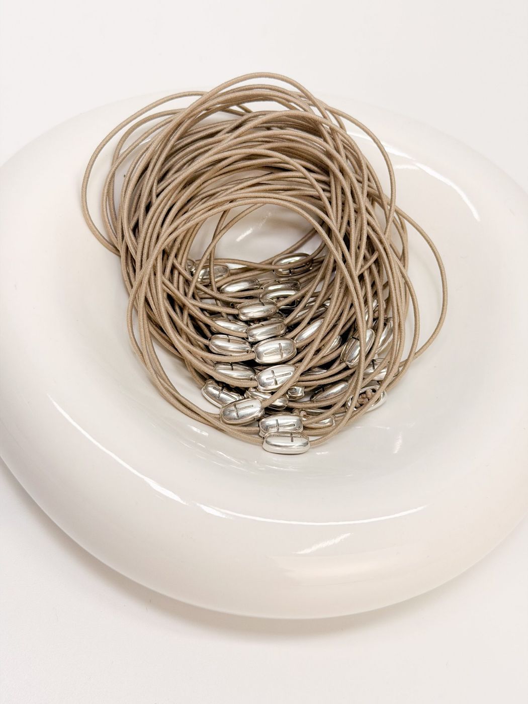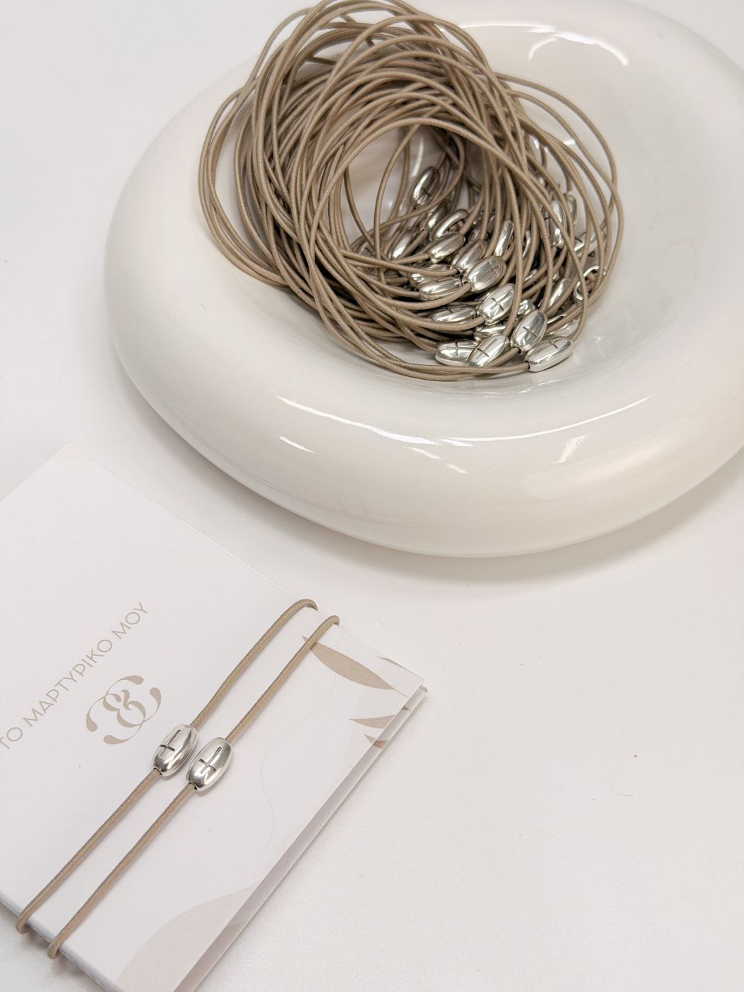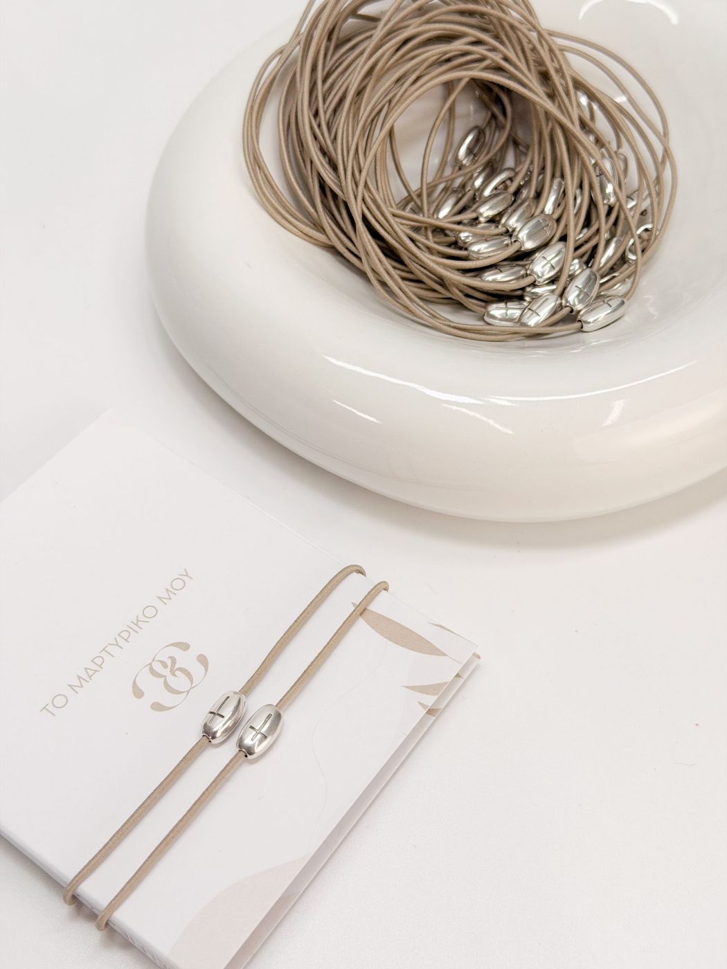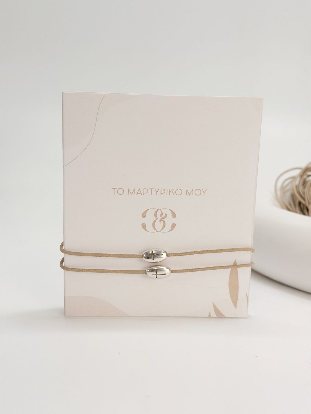 Μαρτυρικό βραχιόλι με ελαστικό μπεζ κορδόνι και σταυρό σε ασημί απόχρωση.