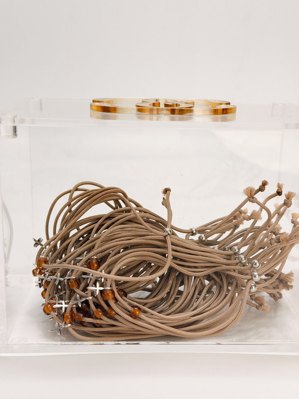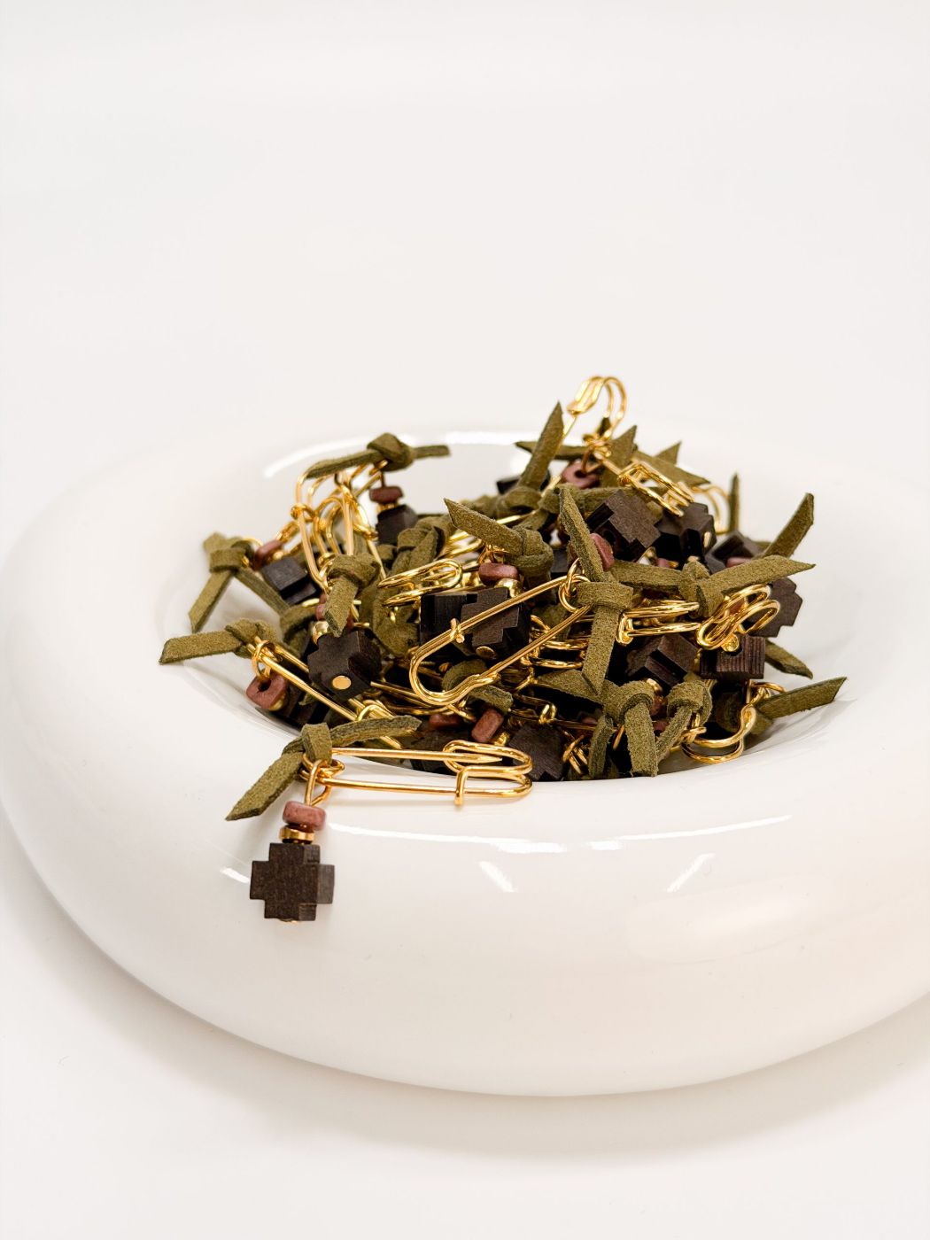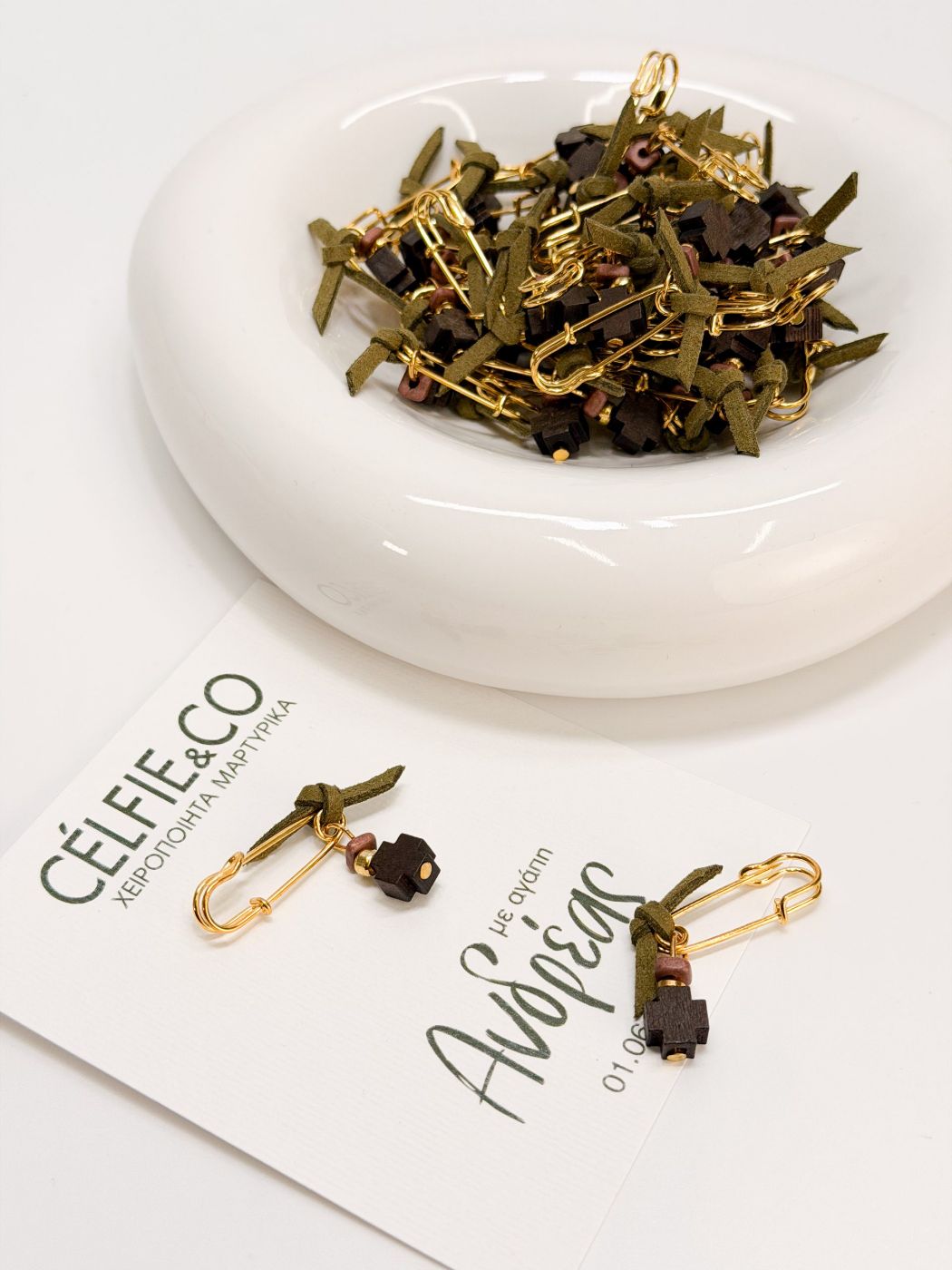 αρτυρικό πέτο με χακί σουετ,καφέ ξύλινο σταυρό και κεραμική ροδέλα.