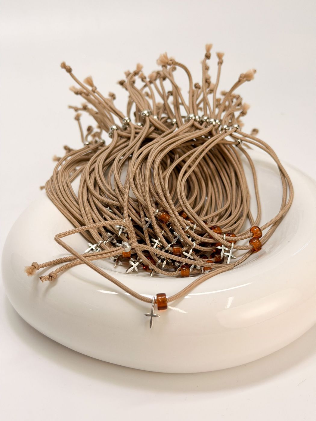 Μαρτυρικό βραχιόλι με μπεζ κορδόνι,καφέ χάντρα και σταυρό σε ασημί απόχρωση.