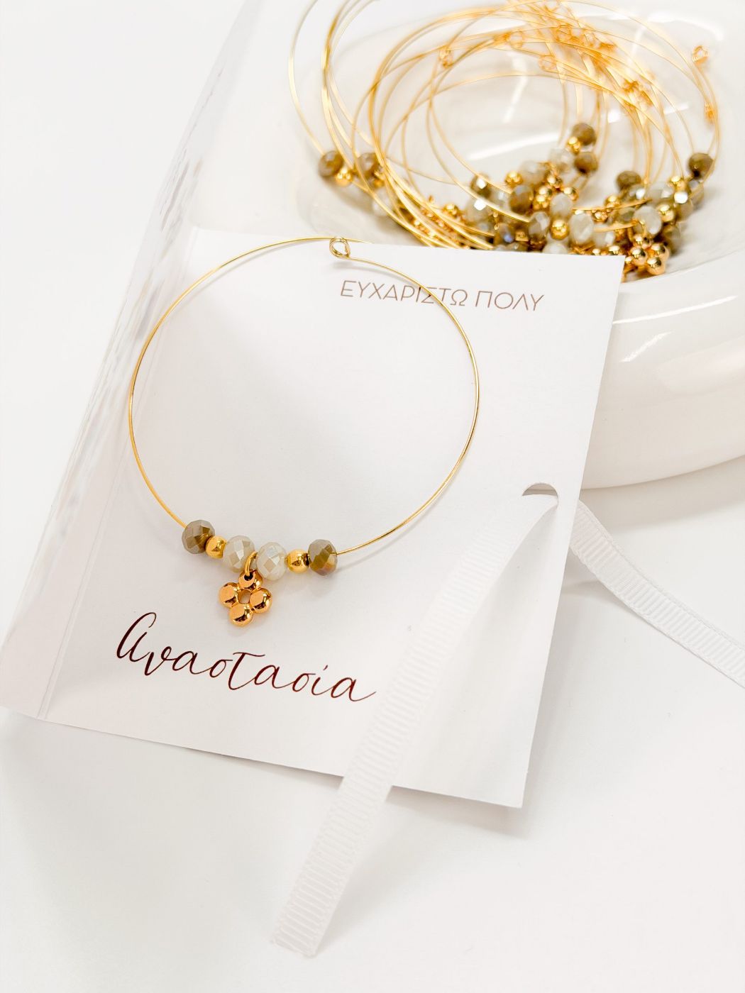 Μαρτυρικό βραχιόλι με memory wire, κρύσταλλα και επιχρυσωμένο σταυρό.