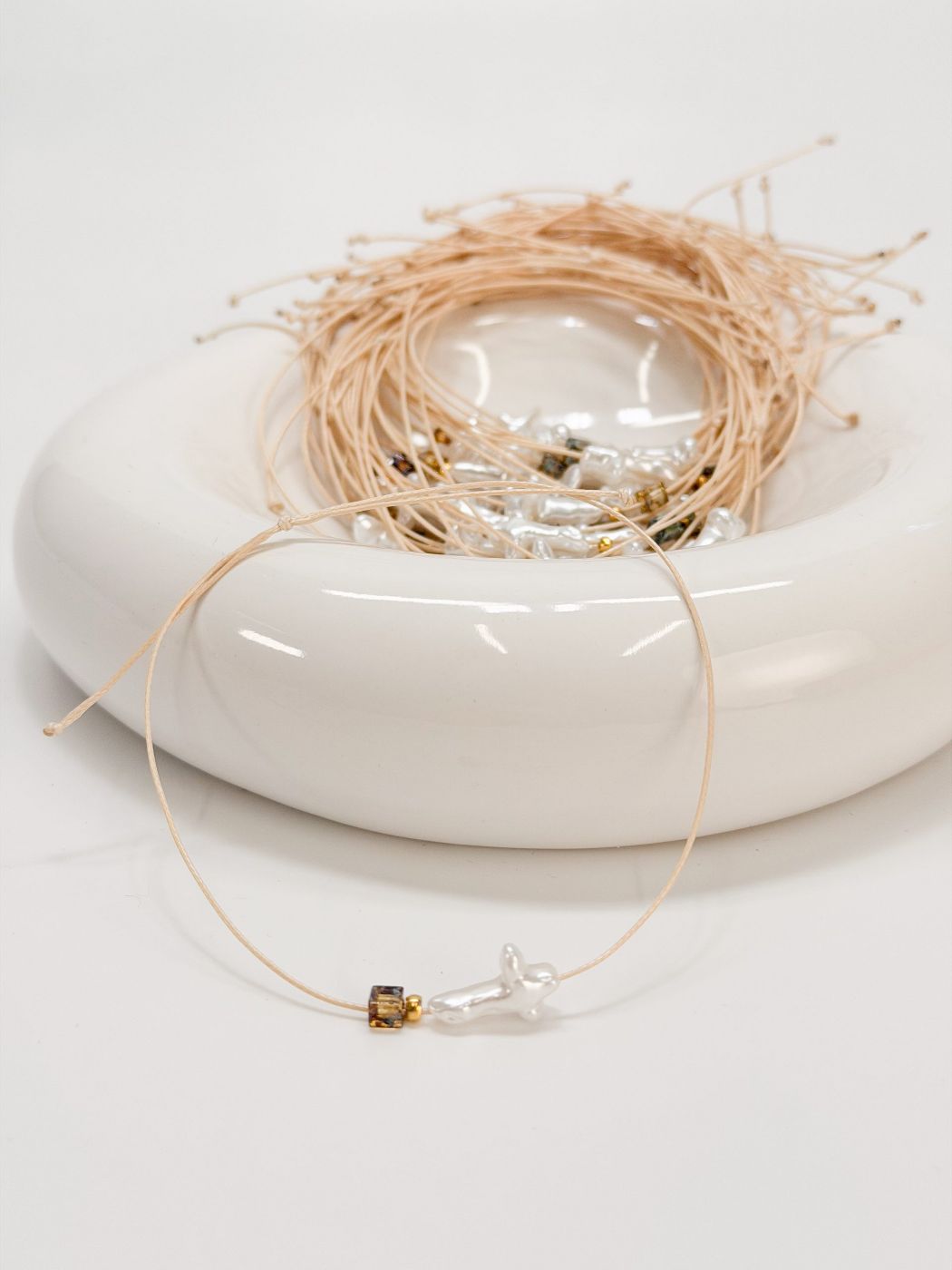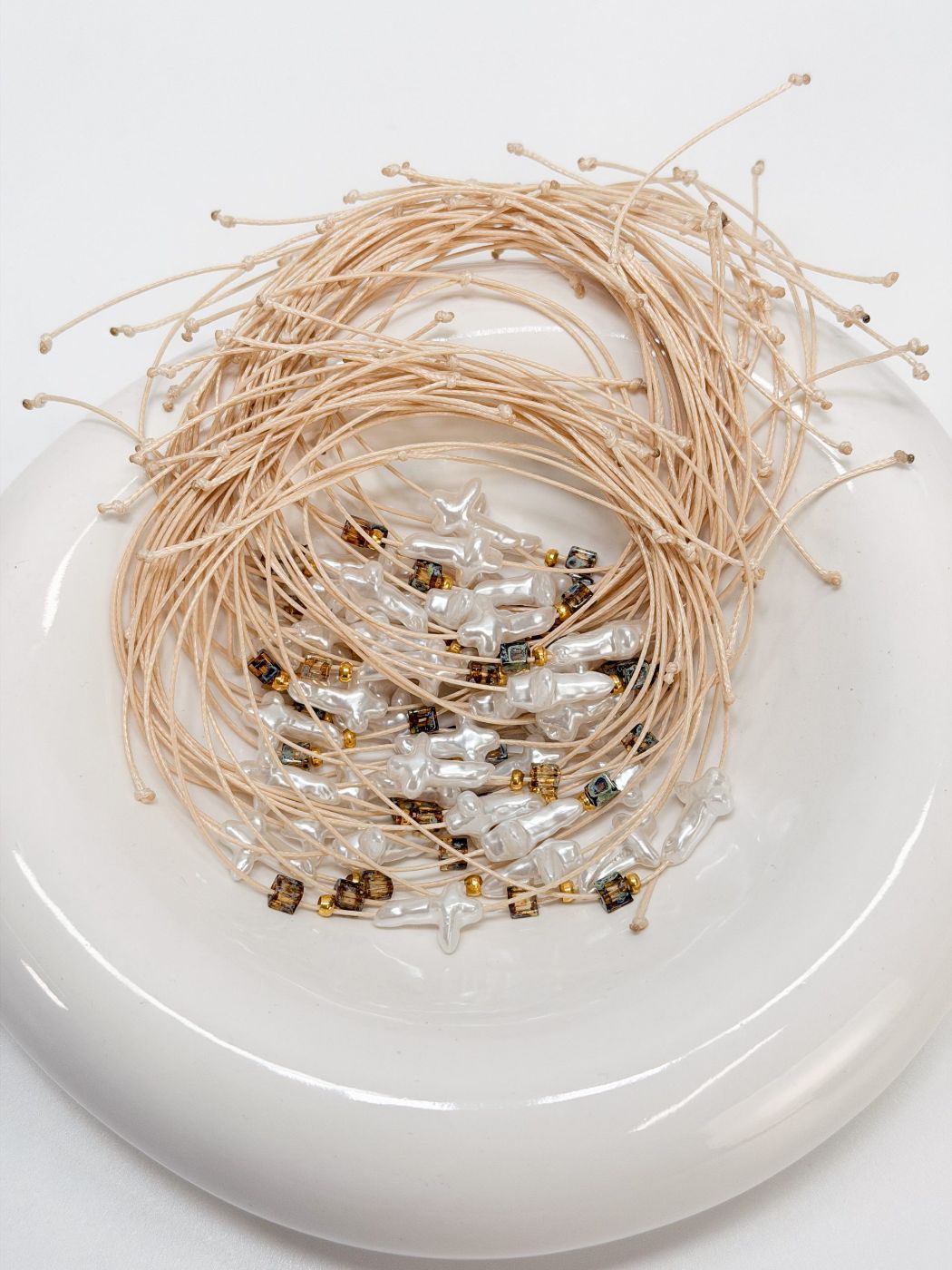 Μαρτυρικό βραχιόλι με περλέ σταυρό, εκρού κορδόνι λεπτό και κυβάκι miyuki.