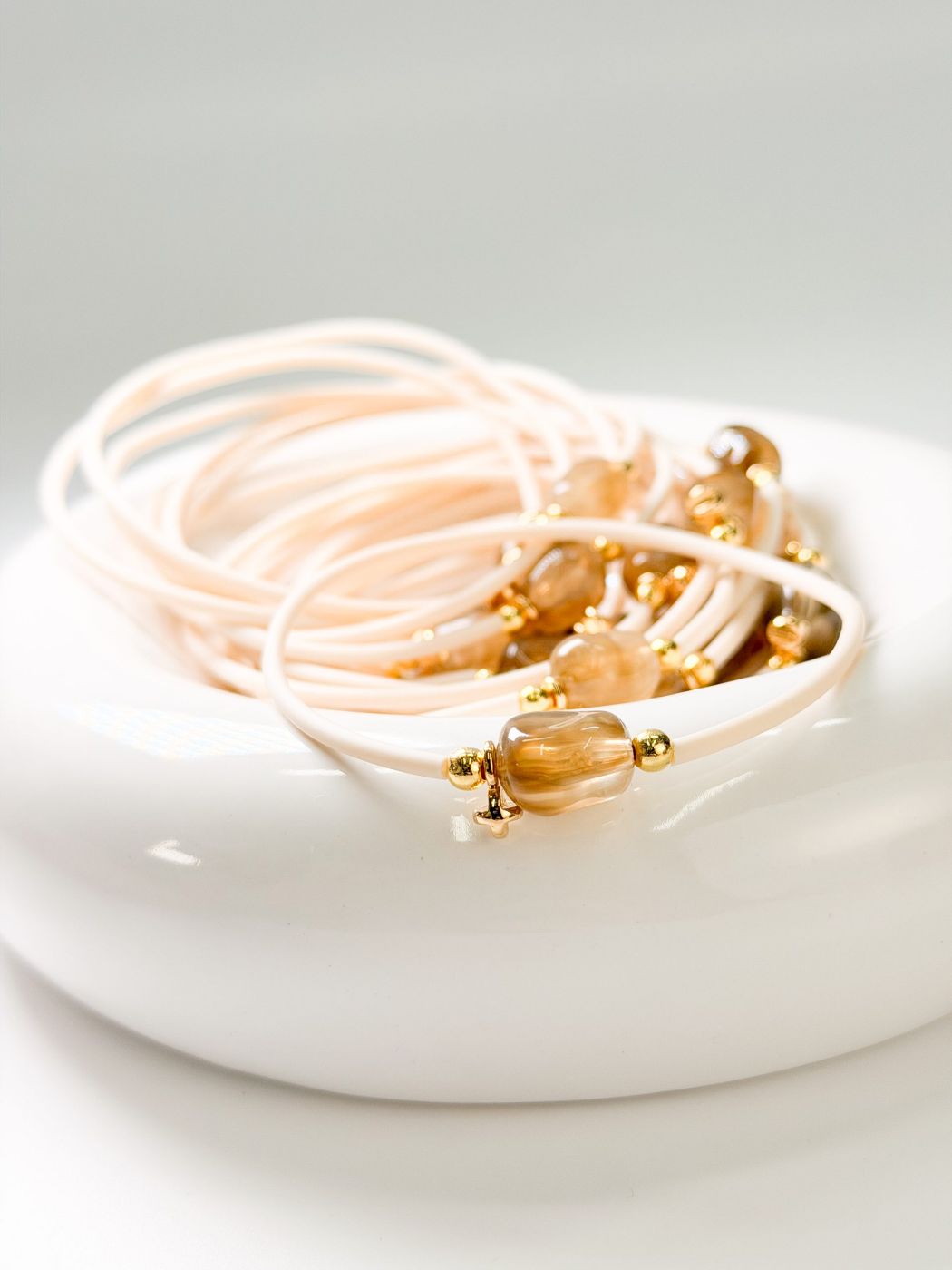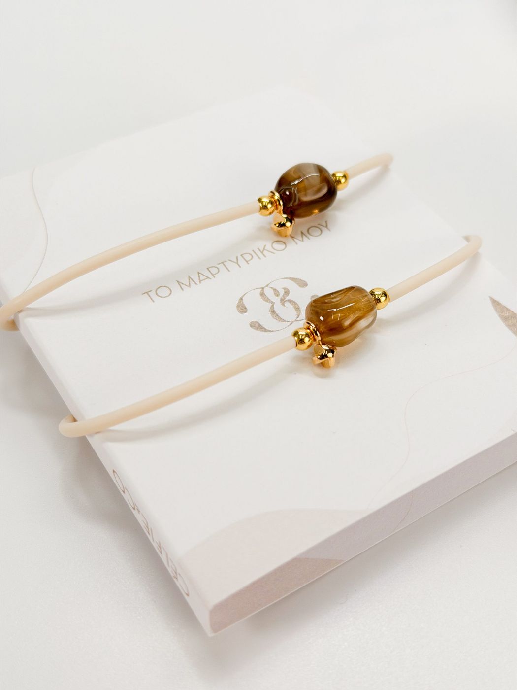 Μαρτυρικό βραχιόλι με εκρού καουτσούκ κορδόνι, καφέ δίχρωμη ακρυλική πέτρα και επιχρυσωμένο σταυρό.