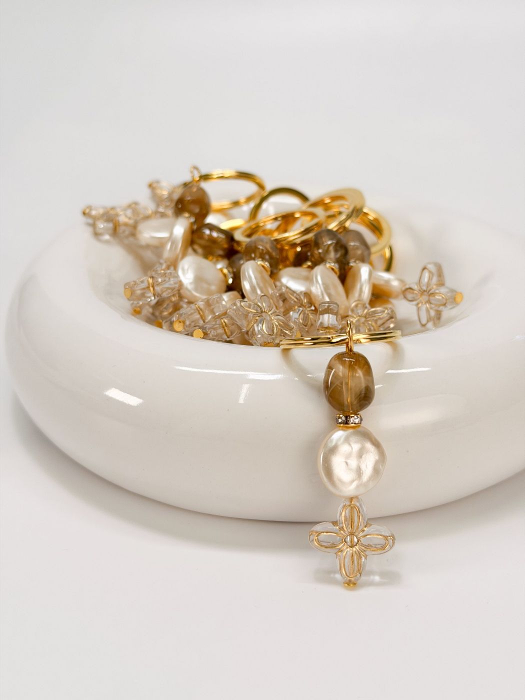 Μαρτυρικό μπρελόκ με καφέ ακρυλική χάντρα, ροδέλα με στρας, πλακέ στρογγυλή πέρλα και ακρυλικό σταυρό σε σχήμα λουλουδιού.
