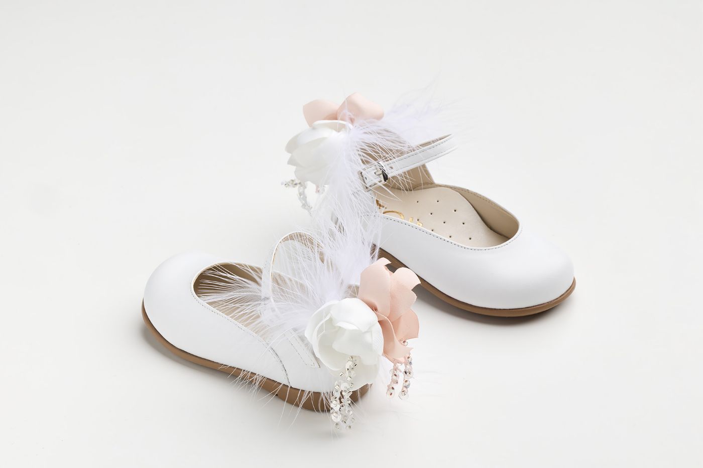 Μπαλαρίνα περπατήματος σε λευκό δέρμα με χειροποίητο διακοσμητικό με off white και dusty pink συνθεση λουλουδιών