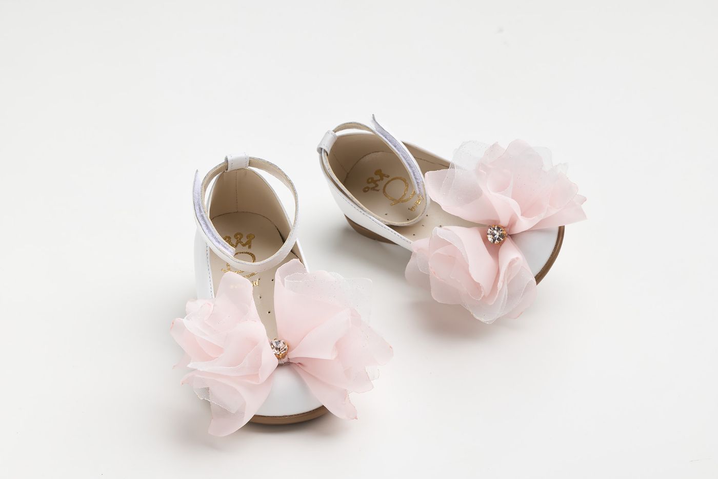 Μπαλαρίνα περπατήματος σε λευκό δέρμα με χειροποίητο διακοσμητικό από ροζ μουσελίνα και στρας