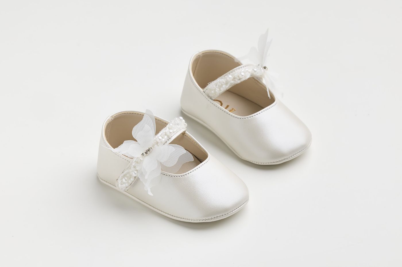 K612E - Μπαλαρίνα αγκαλιάς σε εκρού τεχνόδερμα με χάντρες, πέρλες και off white πεταλούδα με στρας