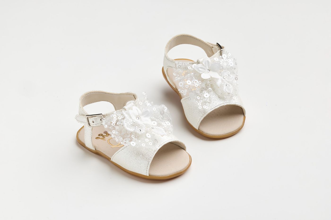 Σανδάλι για τα πρώτα βήματα σε off white γκλιτερ και χειροποίητο off white διακοσμητικό με παγιέτες και λουλούδι