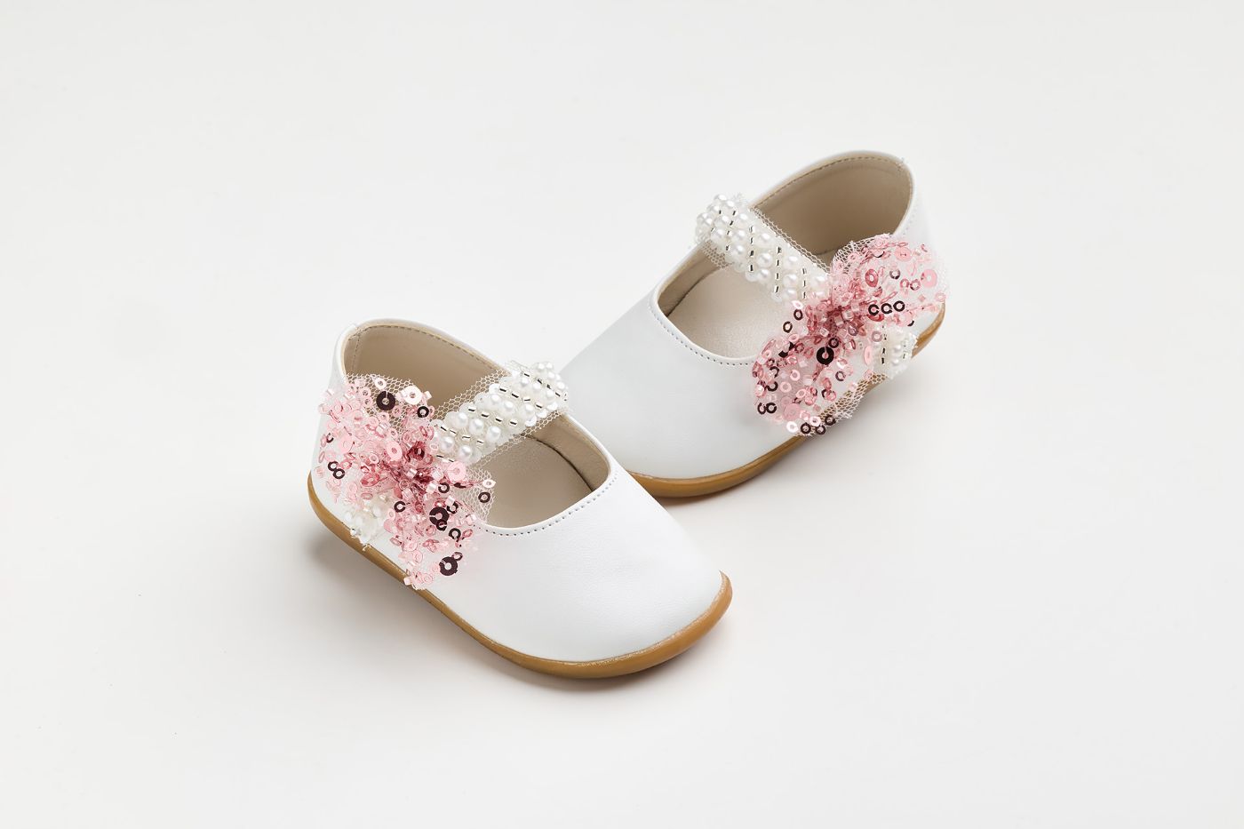 K626A - Μπαλαρίνα για τα πρώτα βήματα σε λευκό τεχνόδερμα με πέρλες και φούξ παγιέτες