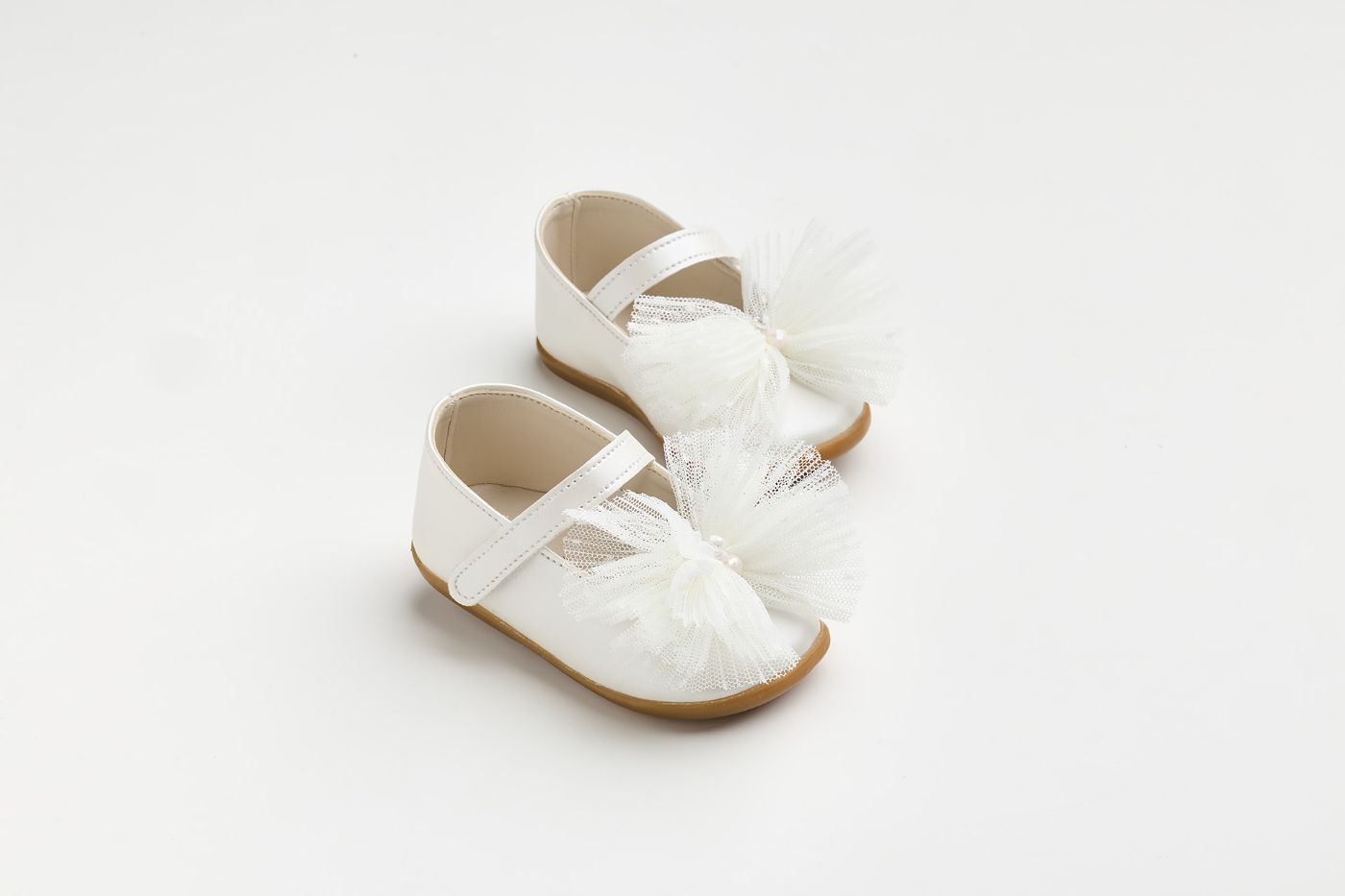 K629E - Μπαλαρίνα για τα πρώτα βήματα σε εκρού τεχνόδερμα με χειροποίητο φιόγκο από εκρού πουά πλισέ τούλι