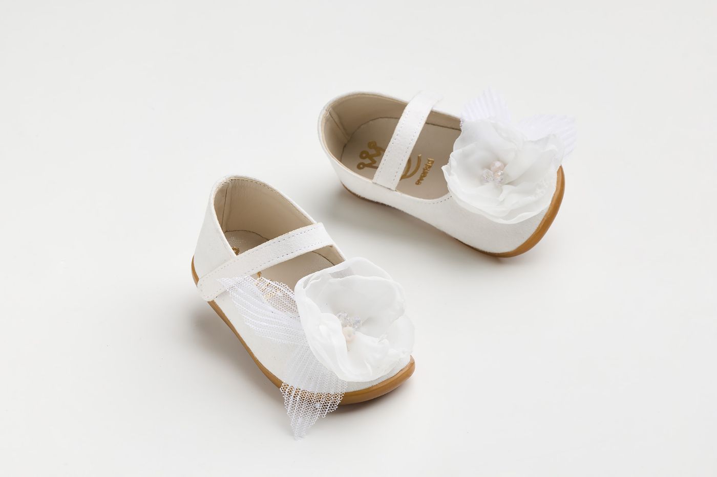 K632A - Μπαλαρίνα για τα πρώτα βήματα σε λευκό συνθετικό καστόρ με χειροποίητο off white λουλούδι και πουα πλισε τούλι