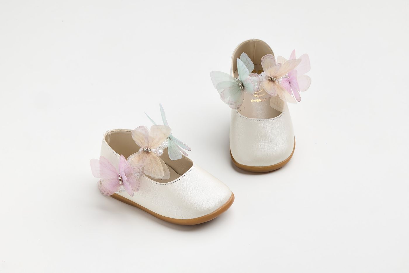 Μπαλαρίνα για τα πρώτα βήματα σε εκρού τεχνόδερμα διακοσμημένο με χάντρες, πεταλούδες και στρας