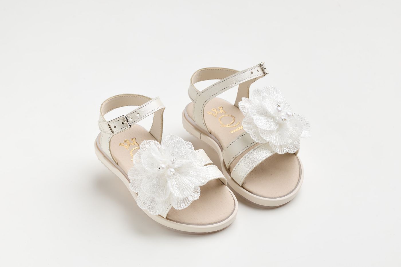 Σανδάλι περπατήματος σε εκρού δέρμα και off white γκλιτερ με λουλούδι κεντημένο με παγιέτες
