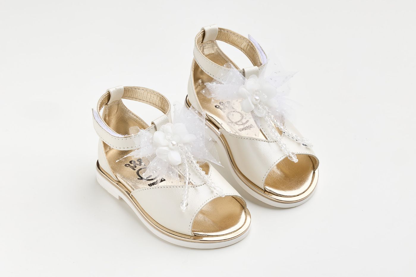 Σανδάλι περπατήματος σε εκρού δέρμα διακοσμημένο με off white χειροποίητο διακοσμητικό τούλι γκλιτερ, λουλούδι και παγιέτες