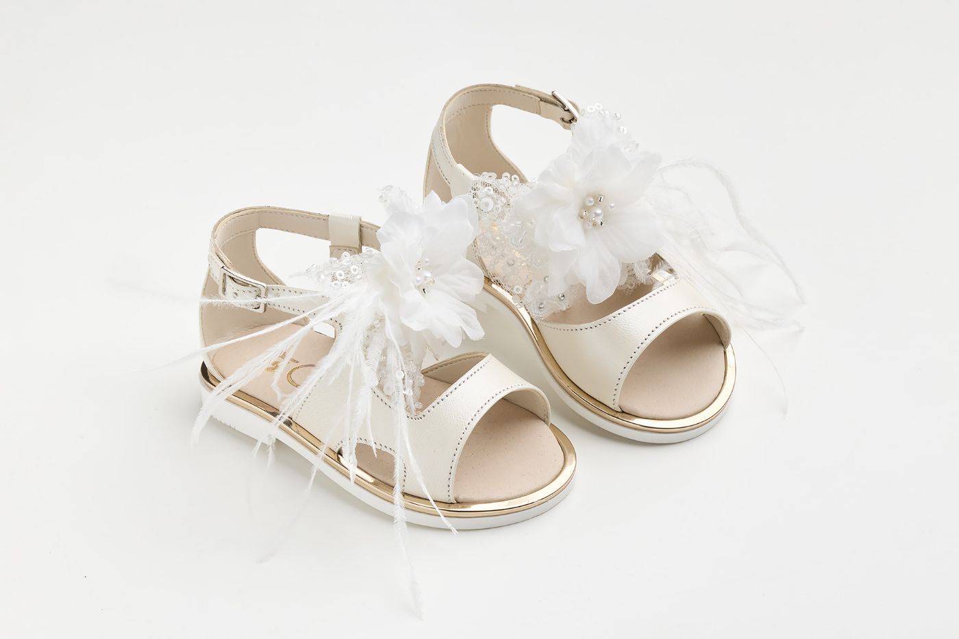 Σανδάλι περπατήματος σε εκρού δέρμα με χειροποιητο off white διακοσμητικό κεντημένο με παγιέτες και φτερά
