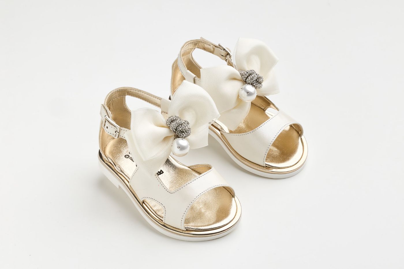 KE15 - Σανδάλι περπατήματος σε εκρού δέρμα με φιογκο από εκρού σατεν και τούλι με στρας και πέρλα