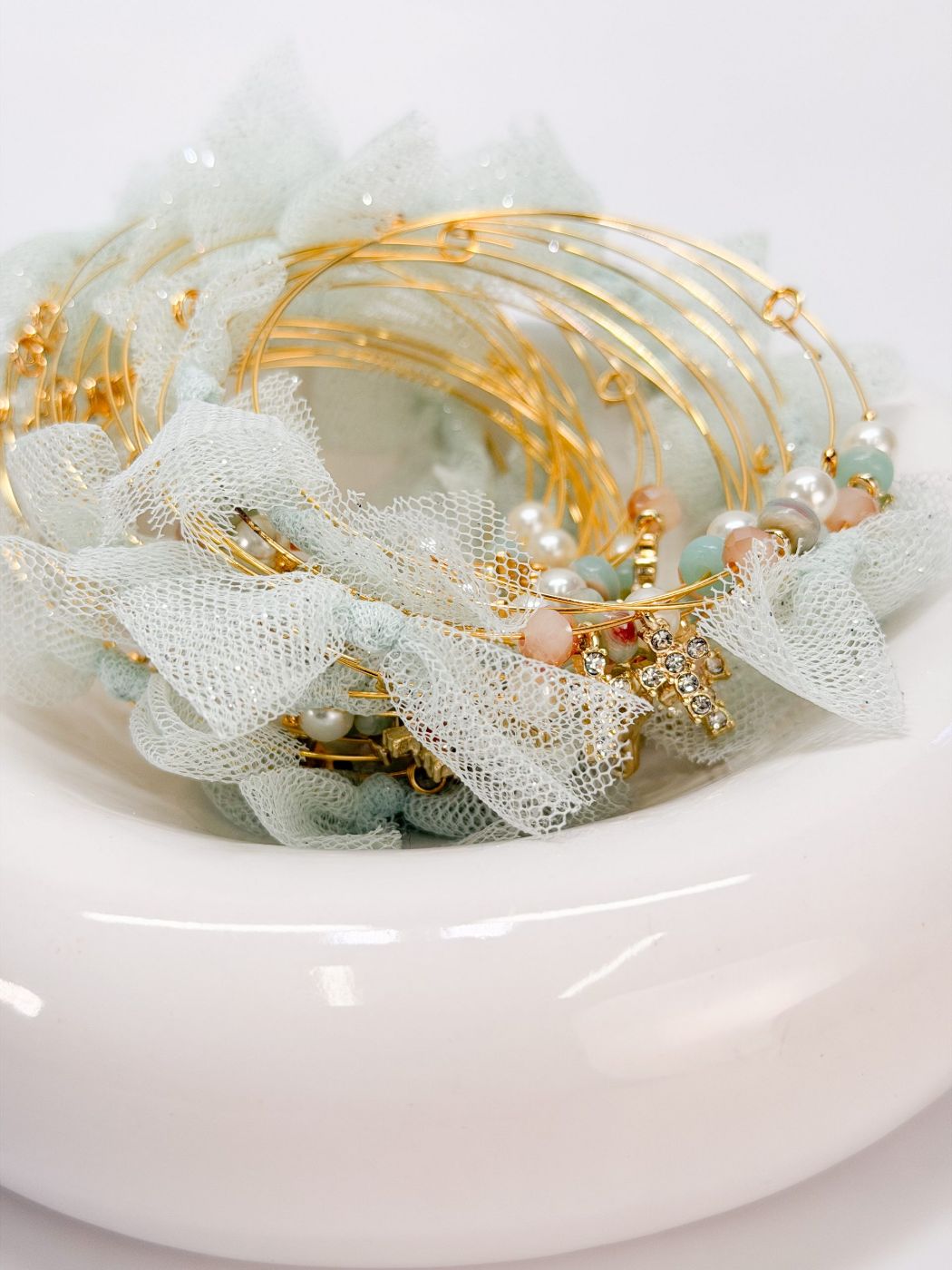 Μαρτυρικό βραχιόλι με memory wire,πέρλα,ακρυλικές δίχρωμες χάντρες,φιογκάκι απο βεραμαν τούλι με ασημι γκλιττερ και επιχρυσωμένο σταυρό με στρας.