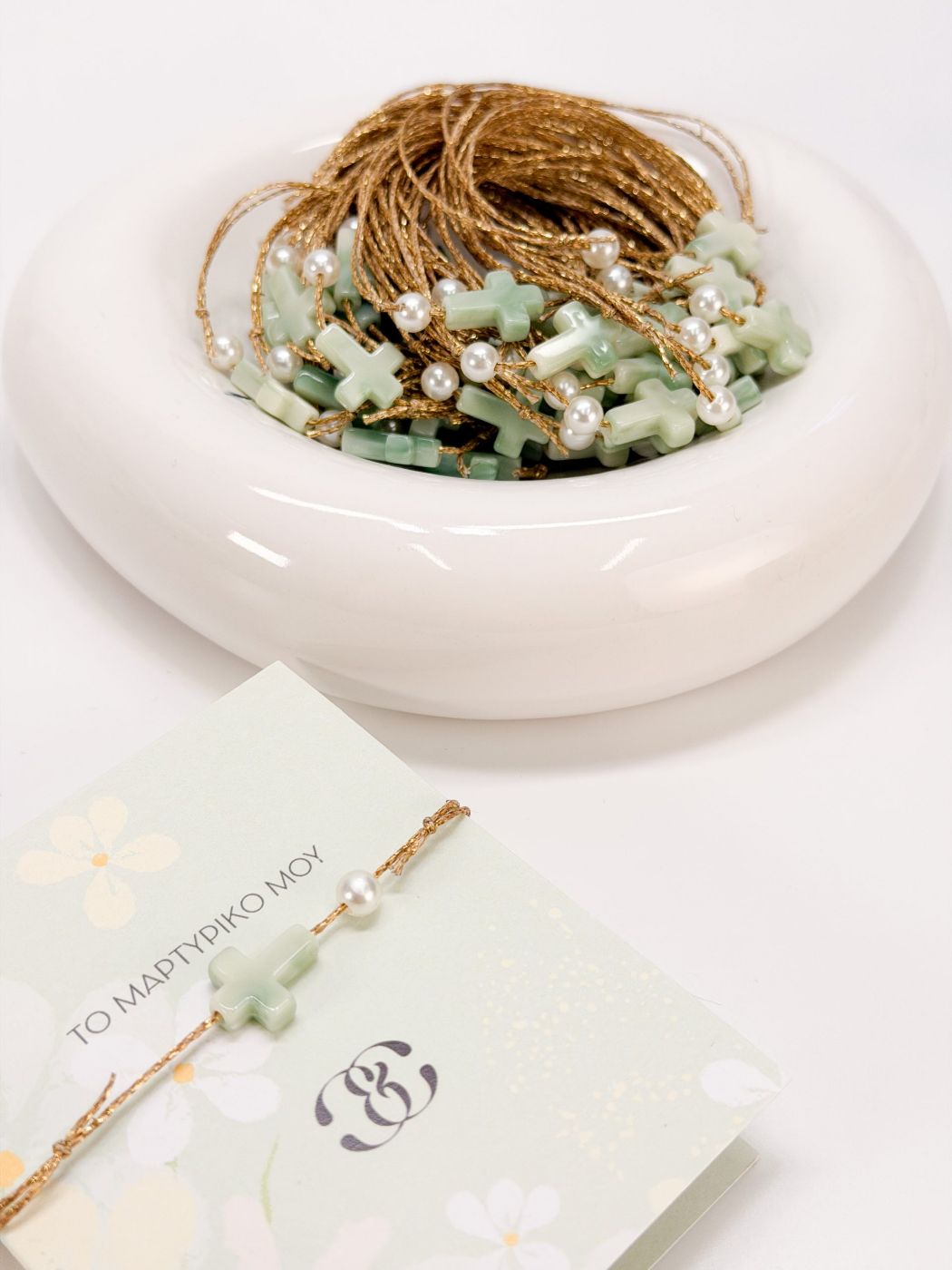 Μαρτυρικό βραχιόλι με χρυσοκλωστή,πέρλα και δίχρωμο σταυρό. Ένα μαρτυρικό δώρο που θα μείνει στους καλεσμένους σας.