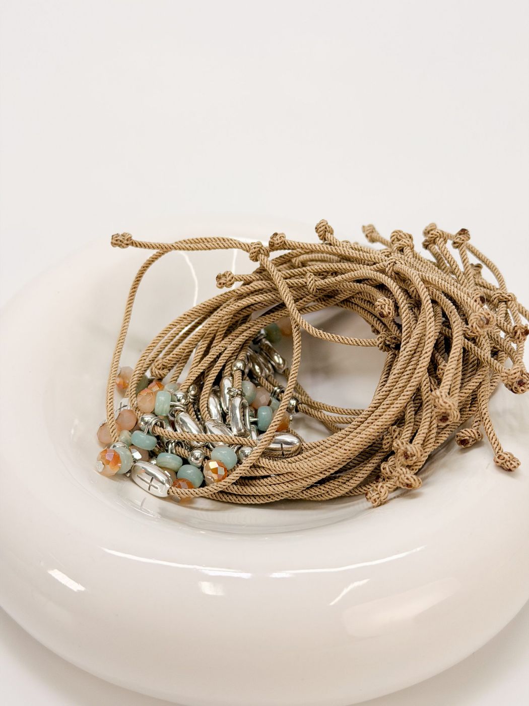 Μαρτυρικό βραχιόλι με μπεζ κορδόνι, δίχρωμη βεραμάν χάντρα, ασημί χάντρα, κρύσταλλο και σταυρό σε ασημί απόχρωση.