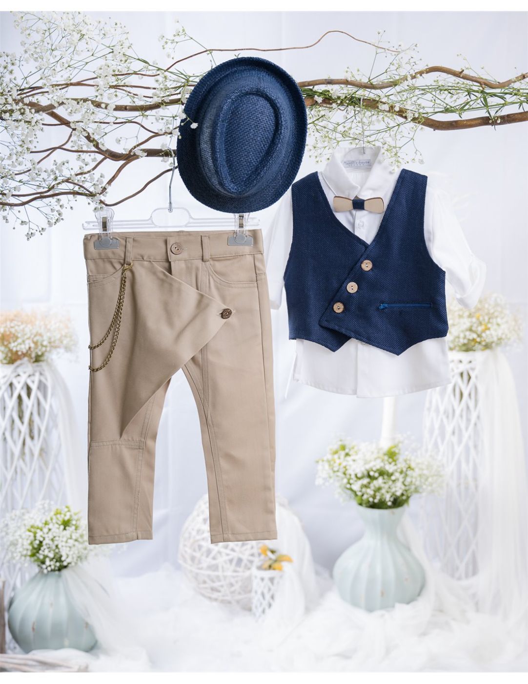 Κομψό βαπτιστικό κοστούμι το οποίο περιλαμβάνει ένα σκούρο μπλε γιλέκο με λοξό κλείσιμο και ιδιαίτερα κουμπιά, παντελόνι σε μπεζ/ταμπά απόχρωση με αλυσίδα στο πλάι, λευκό βαμβακερό πουκάμισο, ξύλινο παπιγιόν και μπλε ψάθινο καπελάκι