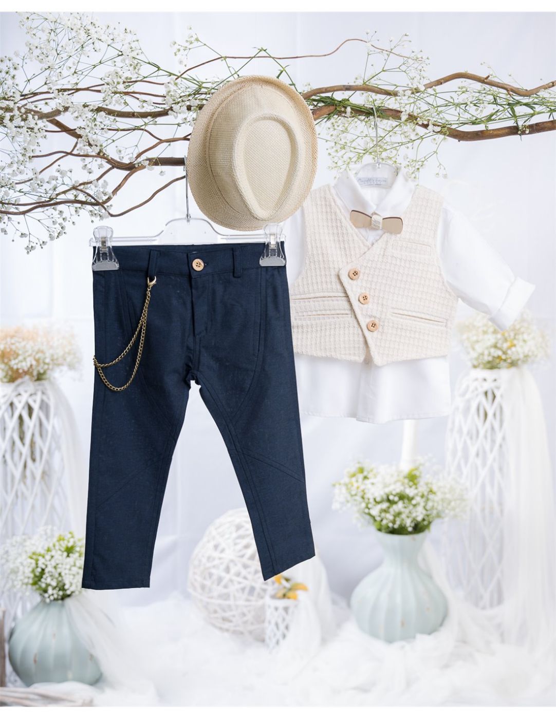 Βαπτιστικό κοστούμι το οποίο περιλαμβάνει γιλέκο σε μπεζ απόχρωση με ανάγλυφη ύφανση και λοξό κλείσιμο, σκούρο μπλε παντελόνι με αλυσίδα στο πλάι, λευκό βαμβακερό πουκάμισο, ξύλινο παπιγιόν και ψάθινο καπελάκι σε μπεζ φυσικό χρώμα