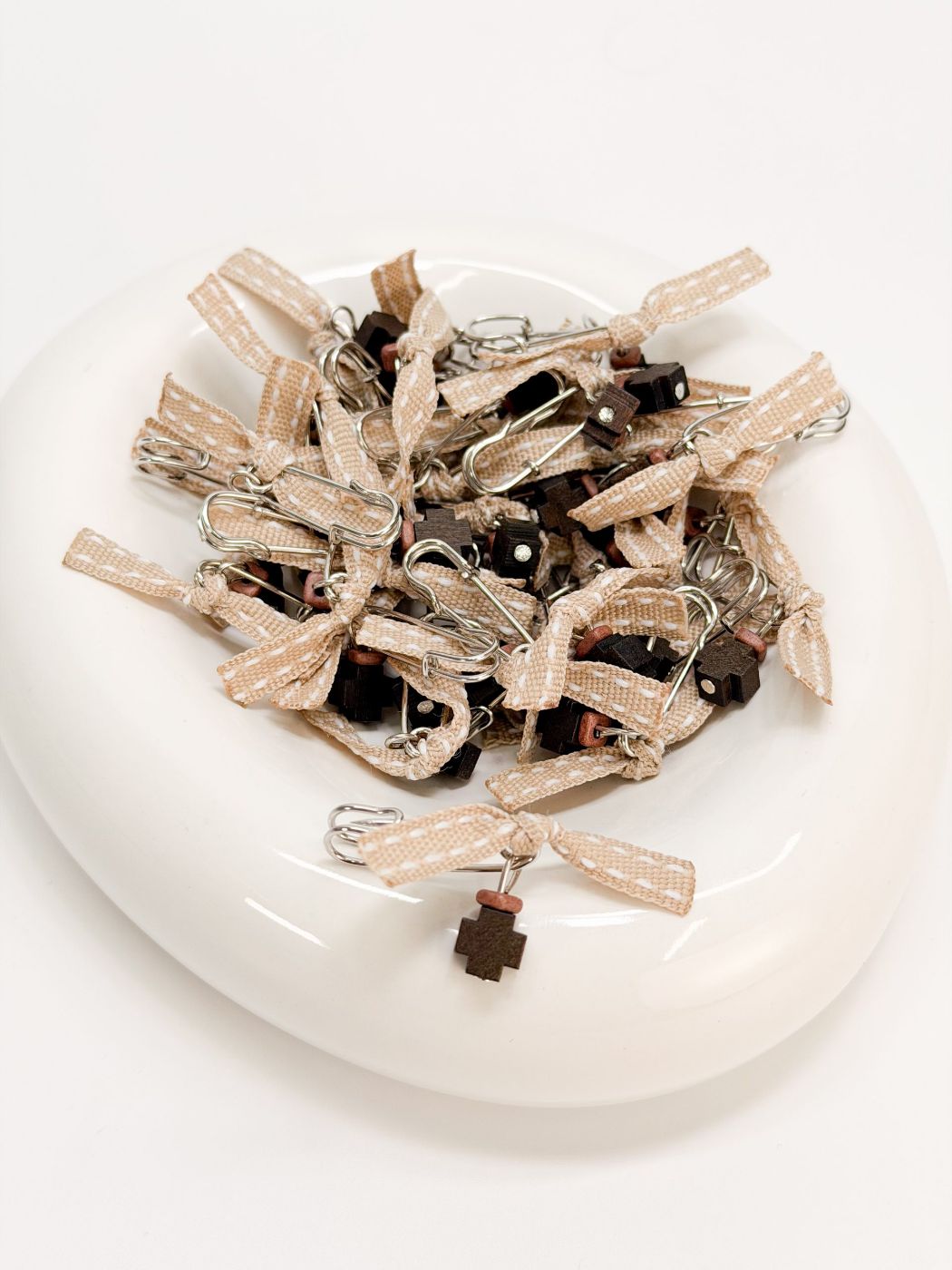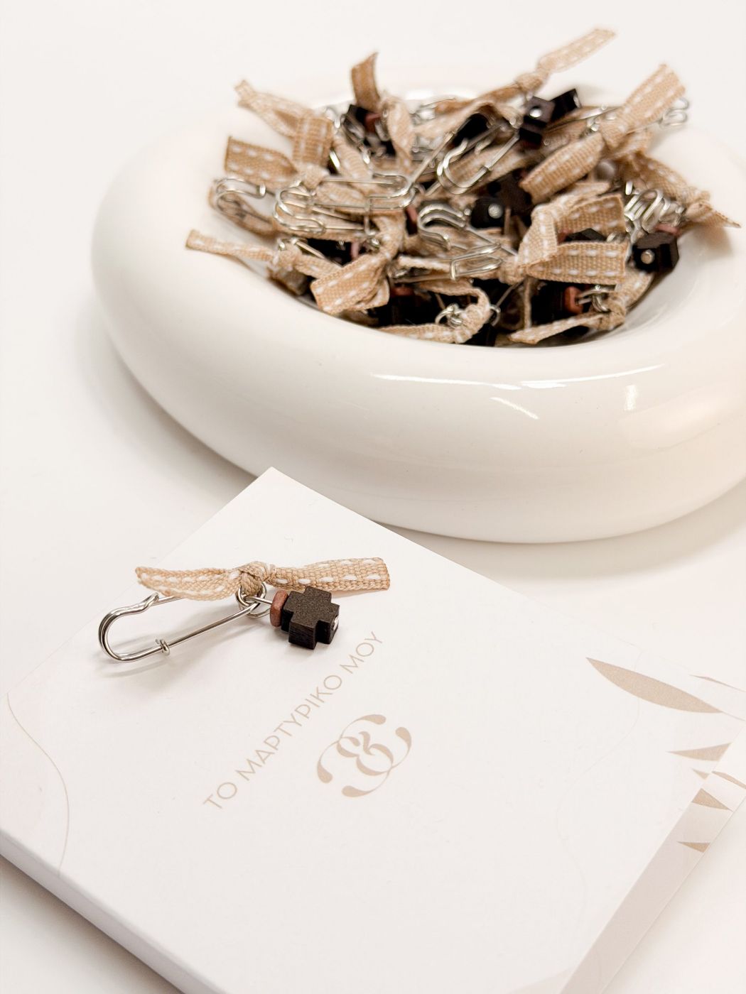 Μαρτυρικό πέτο με παραμάνα σε ασημί απόχρωση,καφέ ξύλινο σταυρό,μπεζ κορδελάκι.