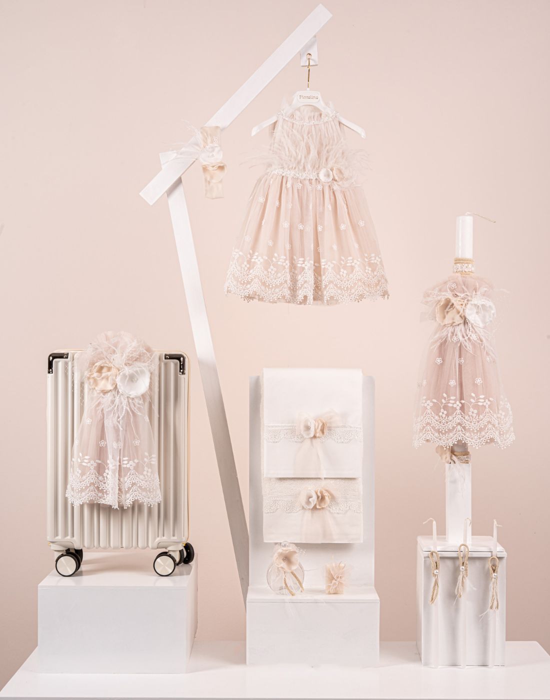 Ολοκληρωμένο πακέτο βάπτισης που περιλαμβάνει: Στολισμένη βαλίτσα ταξιδίου που λειτουργεί ως αποθηκευτικός χώρος για το σετ. Χειροποίητη λαμπάδα στολισμένη με δαντέλα, τούλι και διακοσμητικά στοιχεία που ταιριάζουν στο ύφος "Melody". Σετ λαδόπανων με μεγάλη πετσέτα, σεντονάκι και εσώρουχα και μπουκαλάκι για το λάδι, σαπούνι και τρία κεράκια κολυμπήθρας, όλα πλήρως εναρμονισμένα.