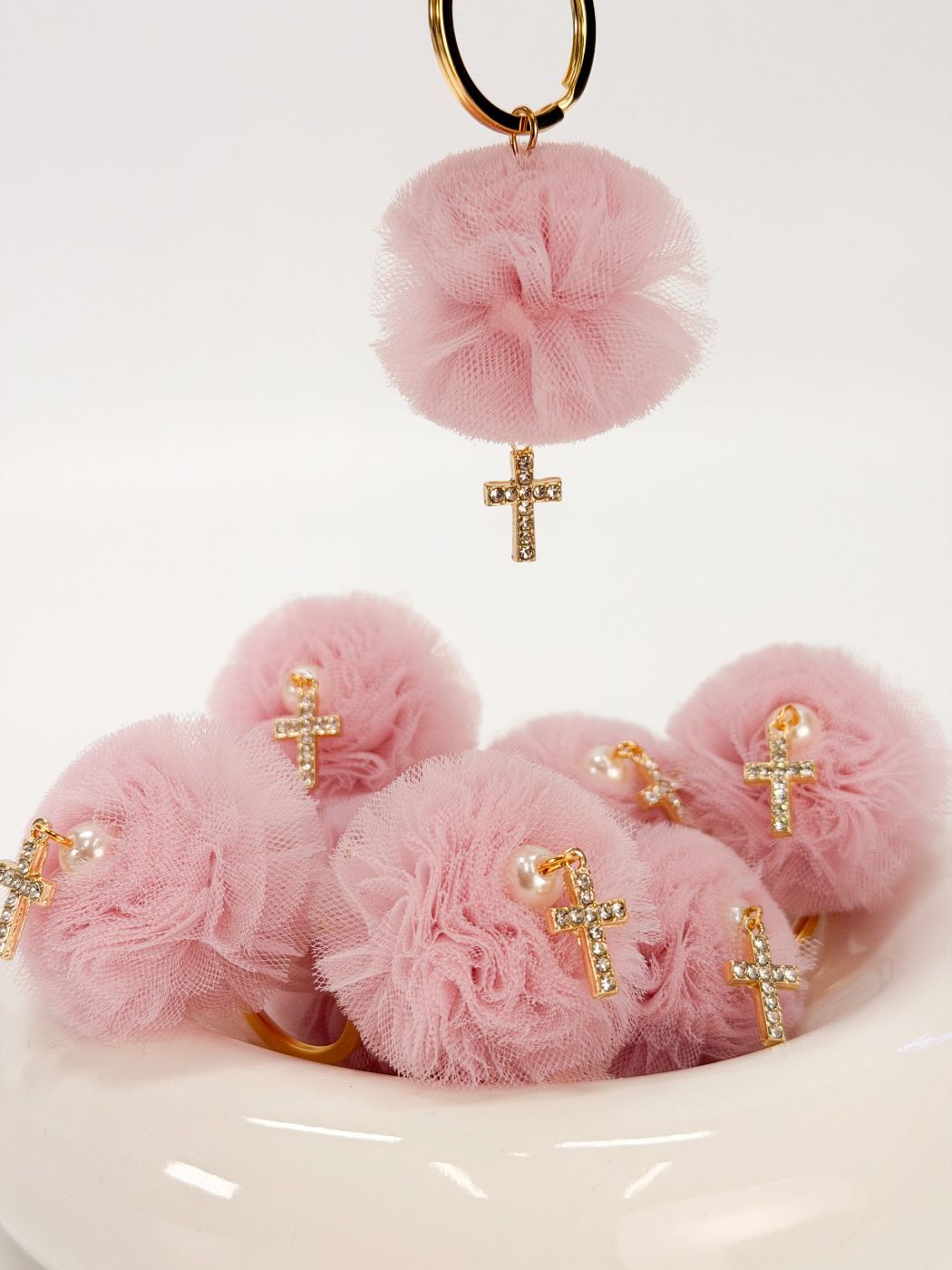 Μαρτυρικό μπρελόκ με ροζ τούλινη φούντα,πέρλα και επιχρυσωμένο σταυρό με στρας.