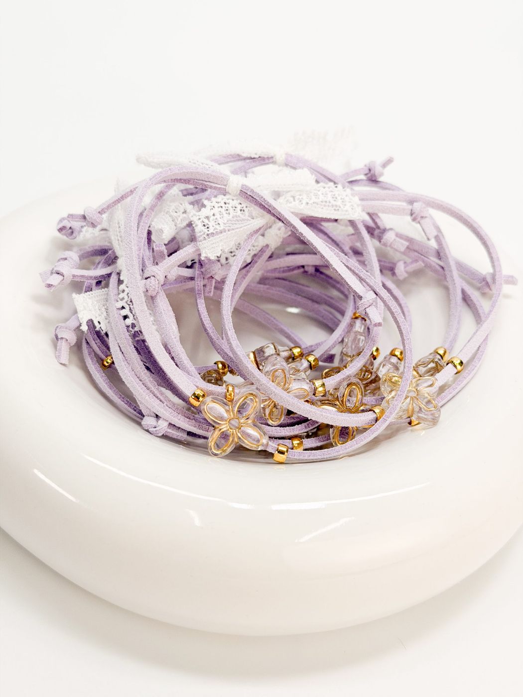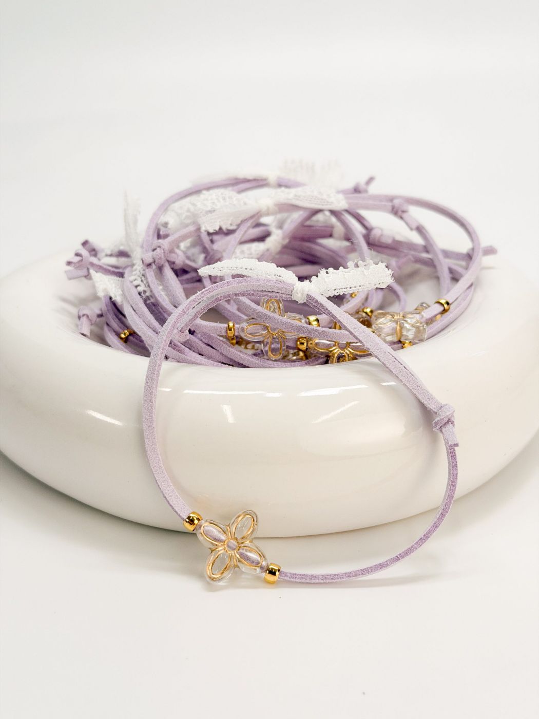 Μαρτυρικό βραχιόλι με λιλά σουετ κορδόνι,ακρυλικό σταυρό σε σχήμα λουλουδιού και δαντέλα.
